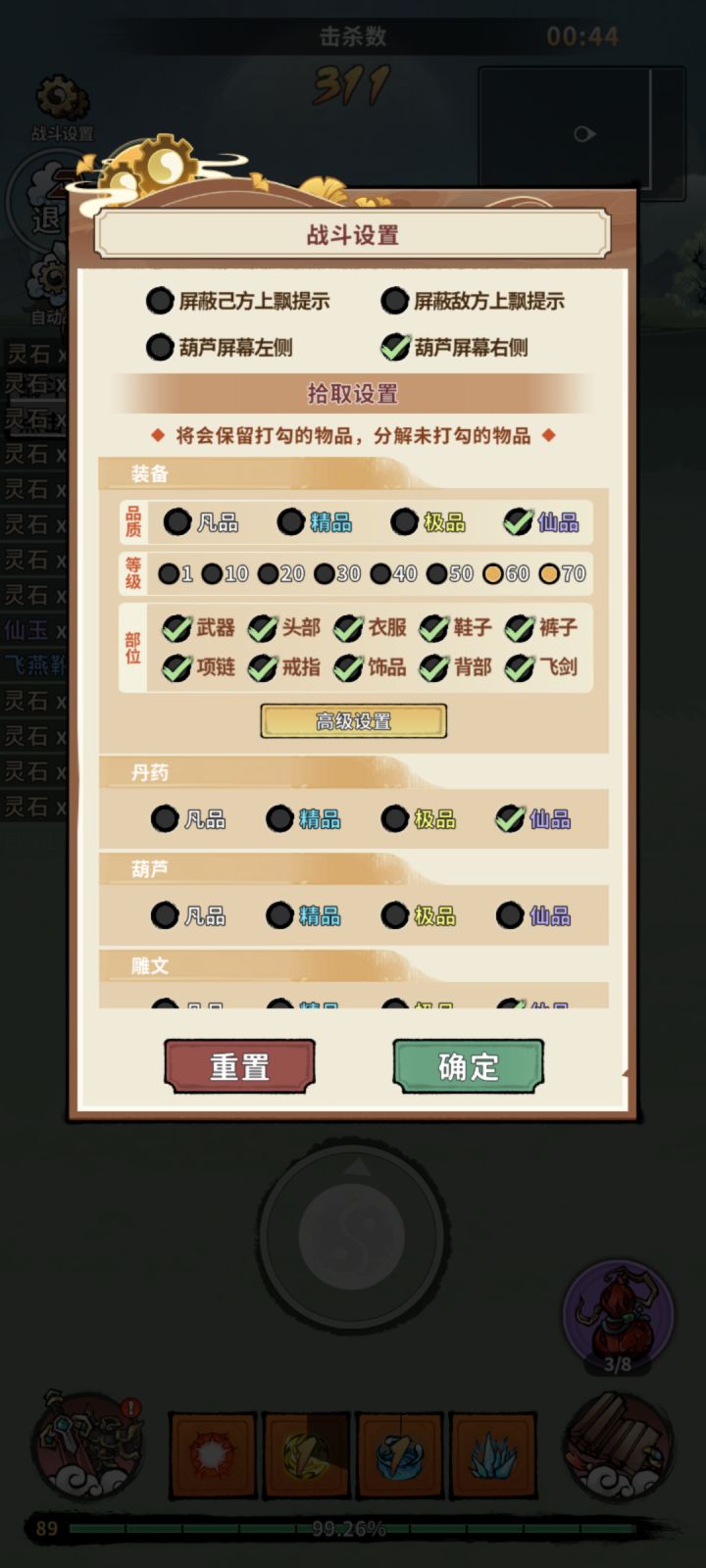 现阶段推出了拾取过滤功能,很多萌新不知道如何设置,如图所示, 一. 只要设置60 70级装备,T级词条全部取消只保留T8(70仙品装备)。 二. 普通词条(能切 画 洗练 精炼的)全部不选。 三. 特殊词条(装备下缀不能洗的词条)只选项链 戒指(大佬们还在测试能否换掉神话戒指所以有好的可以保留) 饰品 暴击率。头盔 裤子 免伤和精英伤害减少 鞋子 ➕2葫芦次数(后面挂机有用) 四. 到此处