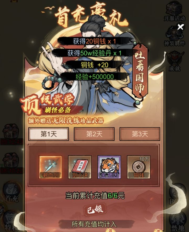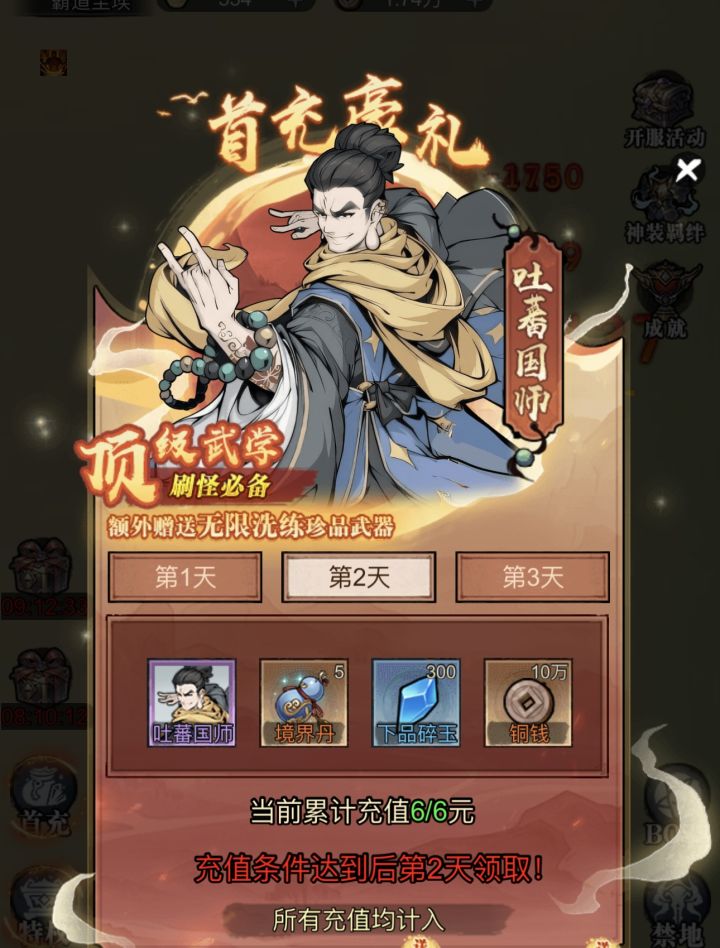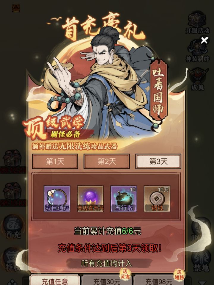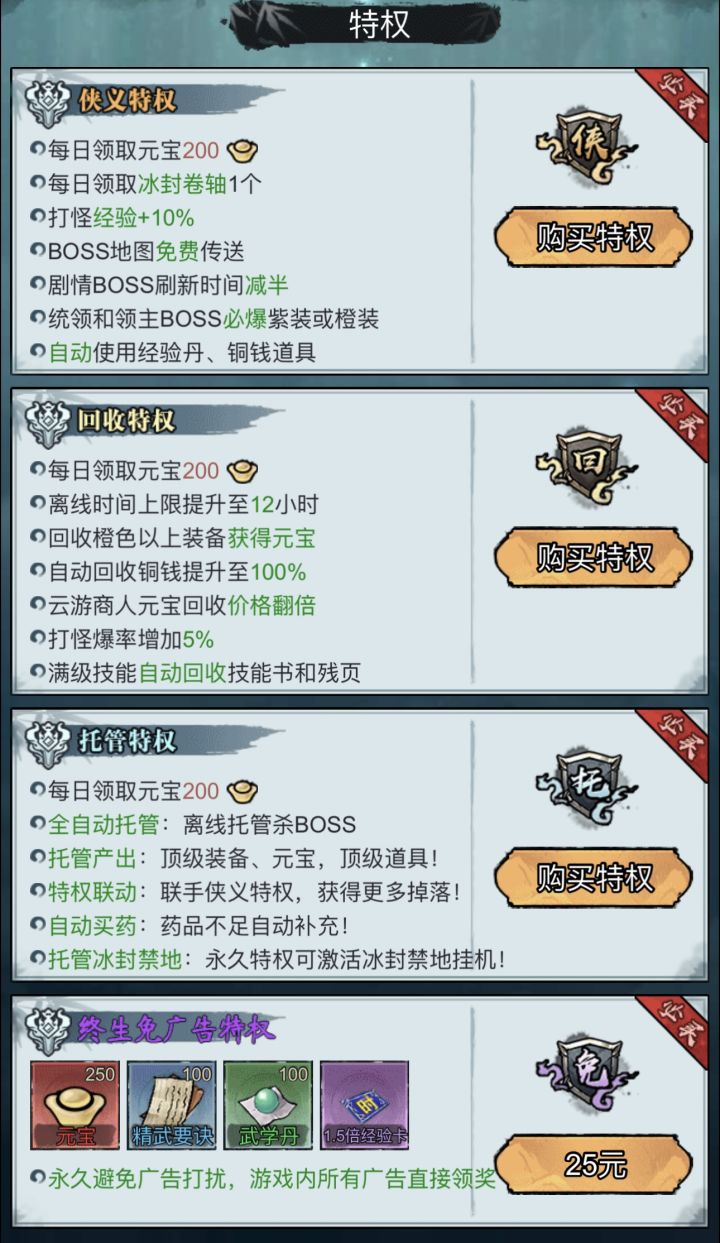 进入游戏 建议大家直接入手首冲 可以获得一件橙色武器(武器可无限洗练) 和一只灵兽 一本橙色武诀更有三天的丰厚奖励 让您游戏体验拉满 前期无论是打boss还是做任务都效率翻倍 建议指数五颗星 适合平民玩家体验游戏 首冲是绝对的物超所值氪金玩家可以选择购买特权解放双手 游戏体验是非常nice的四种特权各有各的优势特点 喜欢挂机的您可以选择托管特权 离线自动打boss 可前往完美挂机处让你挂机效