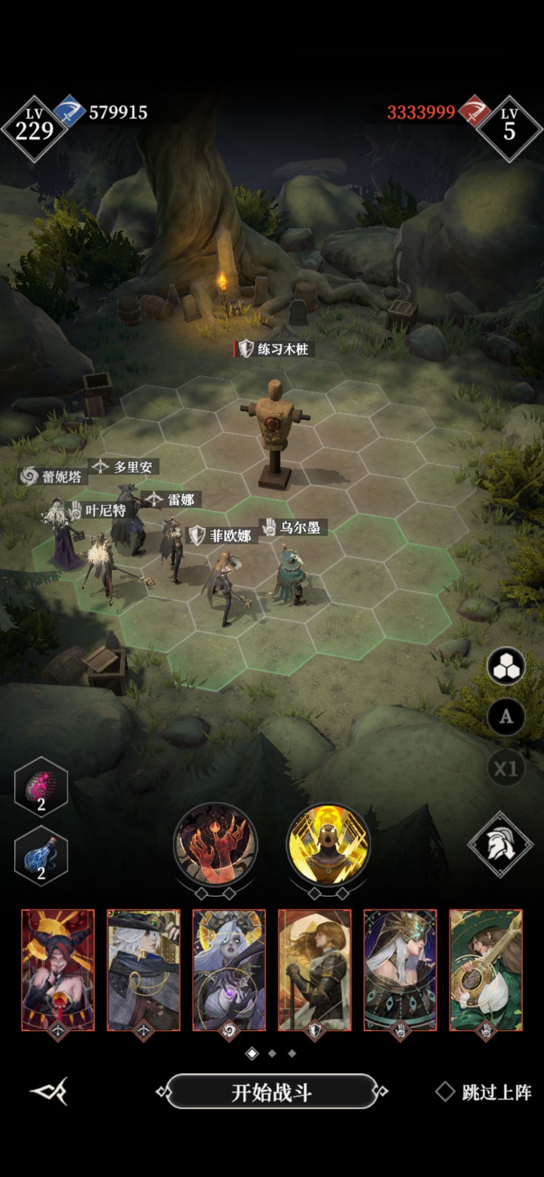 站位见上图,我就打了2次,不难。。。看起来唬人,其实。。。。就挺唬人[表情_尬笑]。没得玩了,要50级才能开下一关,悲剧。。。又要凹墓穴。。[表情_豹哭][表情_豹哭]。 这样站位,boss只会打菲欧娜,普攻打她,技能也只打她,我也不知道为啥。估计是距离远了,boss“鞭”长莫及。。问题是菲欧娜扛不住boss一个技能,所以跟着我策略走即可。 神力:锤子+回春,其实回春没啥用,纯粹就是因为恢复速度快