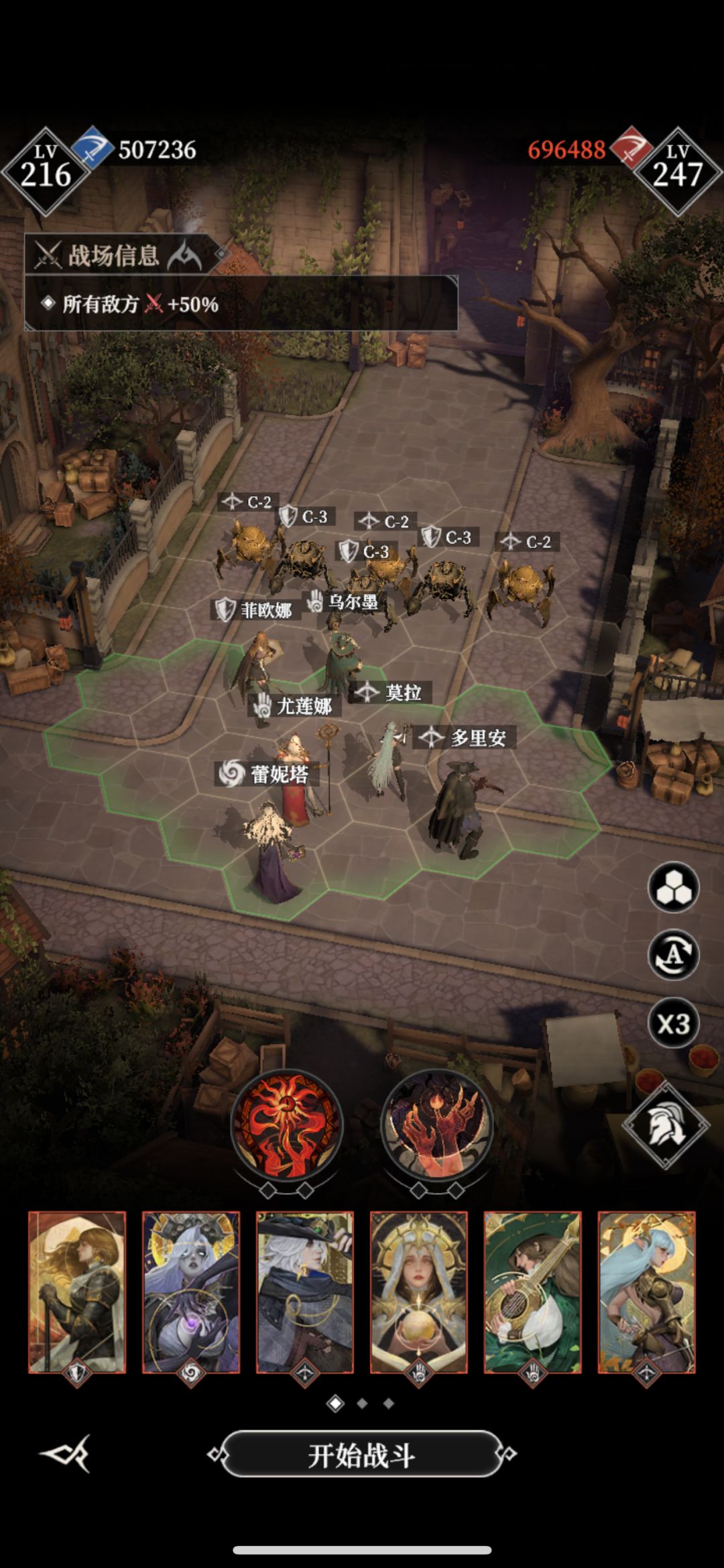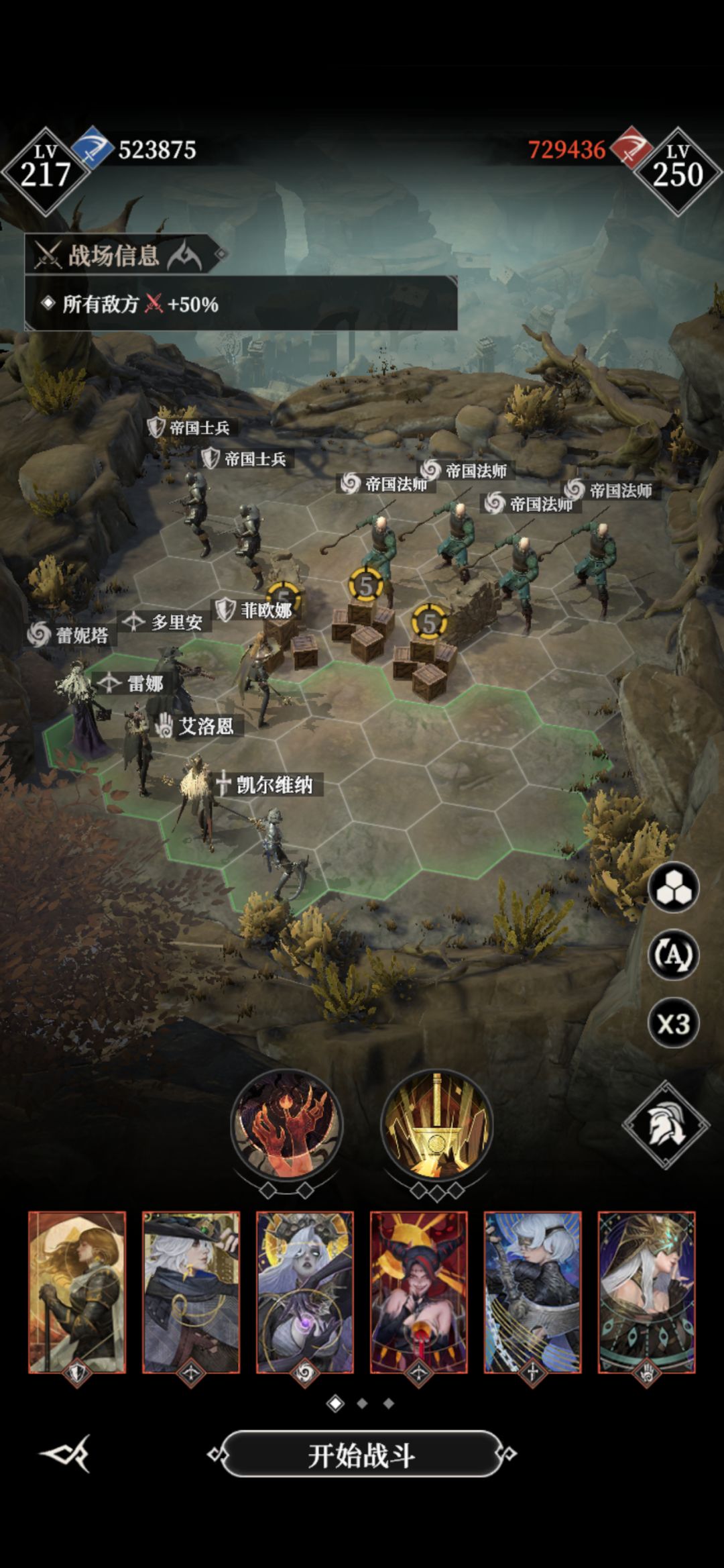 #地下城堡4骑士与破碎编年史 墓穴490 阵容神力站位如图 三个c攻击2.5到2.6,多里安,光盾,黑奶能量套 开局菲欧娜现在第一排最中间,然后给他恶魔 锤子可以打断boss大招,打完只死了菲欧娜
