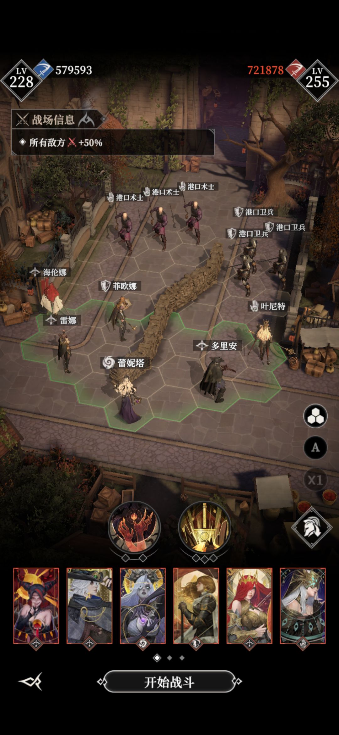 #地下城堡4骑士与破碎编年史 劫掠峭壁一年后boss 女蛮子 神力站位阵容如图 鹿头,多里安,光盾能量套 谷雨攻击2.8,夜魅多里安2.6多 开局丢恶魔给矮子 极限过,需要多试几次,锤子留着砸破了稳固的蛮子