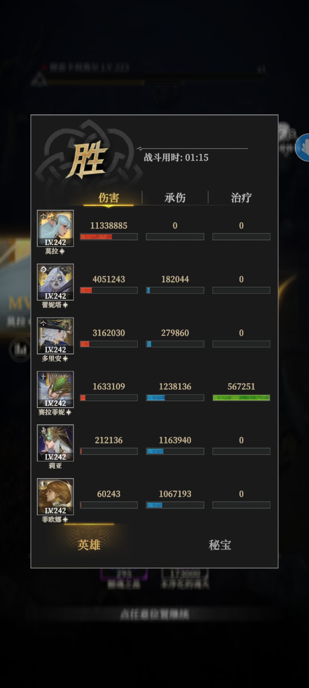 #地下城堡4骑士与破碎编年史 墓穴470 阵容神力如图 两个奶妈能量套,缴械和菲欧娜能量套,两个c纯输出。 打法: Boss大招不会眩晕,不用省治疗。 第一个大招结束后放治疗,光盾的控制能够在他第二个大招出来时候打断,这时候接锤子继续控制。 当他放出第二个大招出来的时候,治疗放完,这时候boss能量条不会满,接第二个治疗。这样光盾可以在他大招的时候满能量。