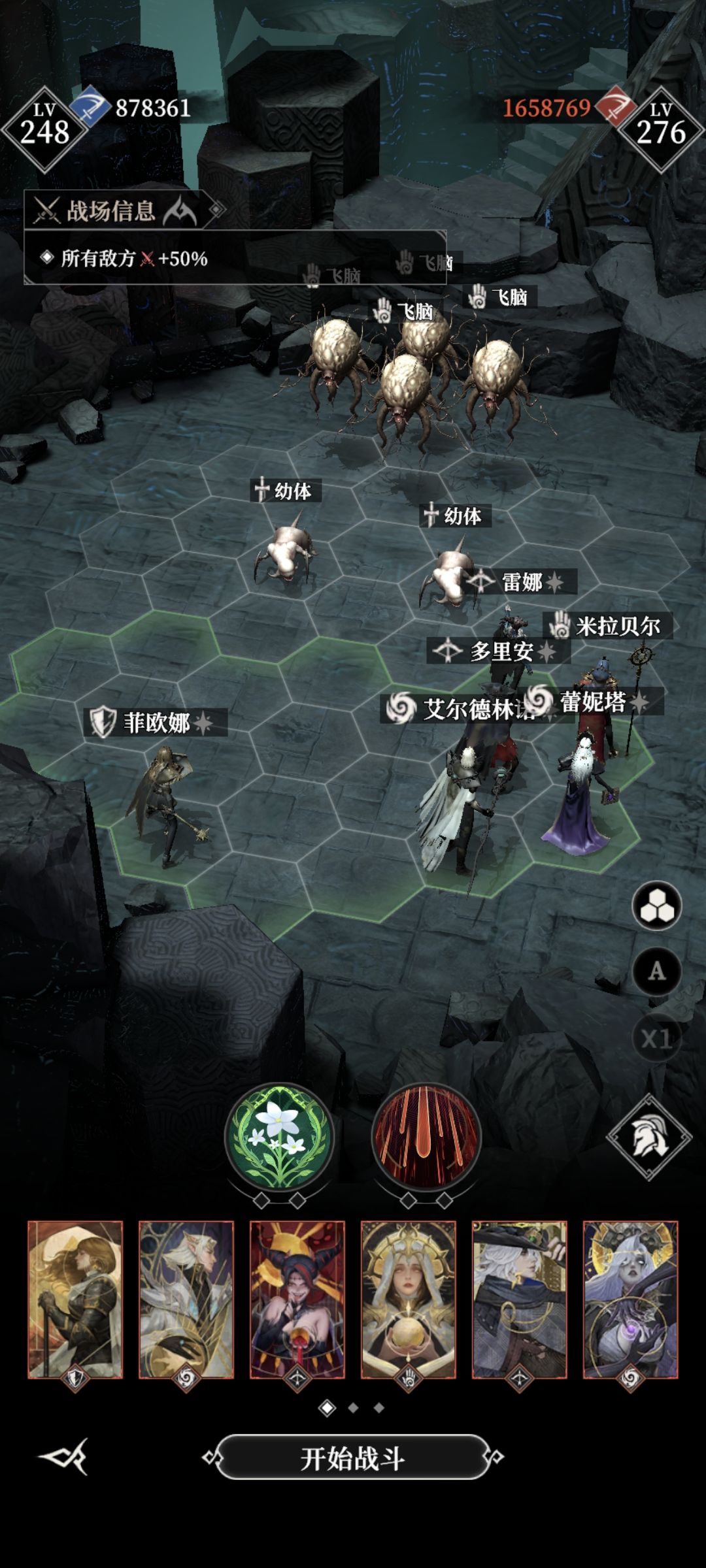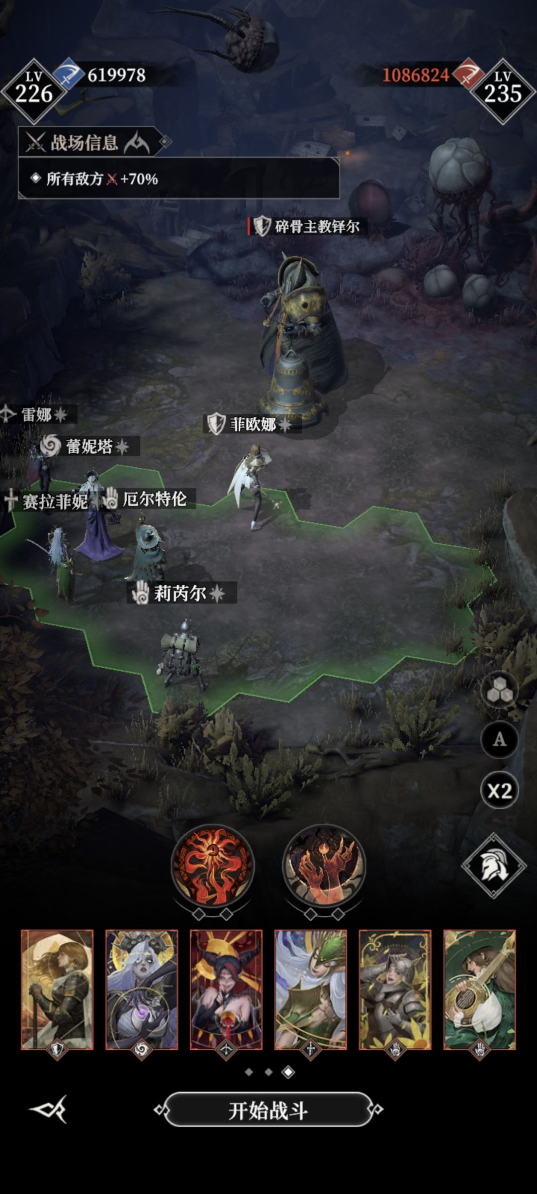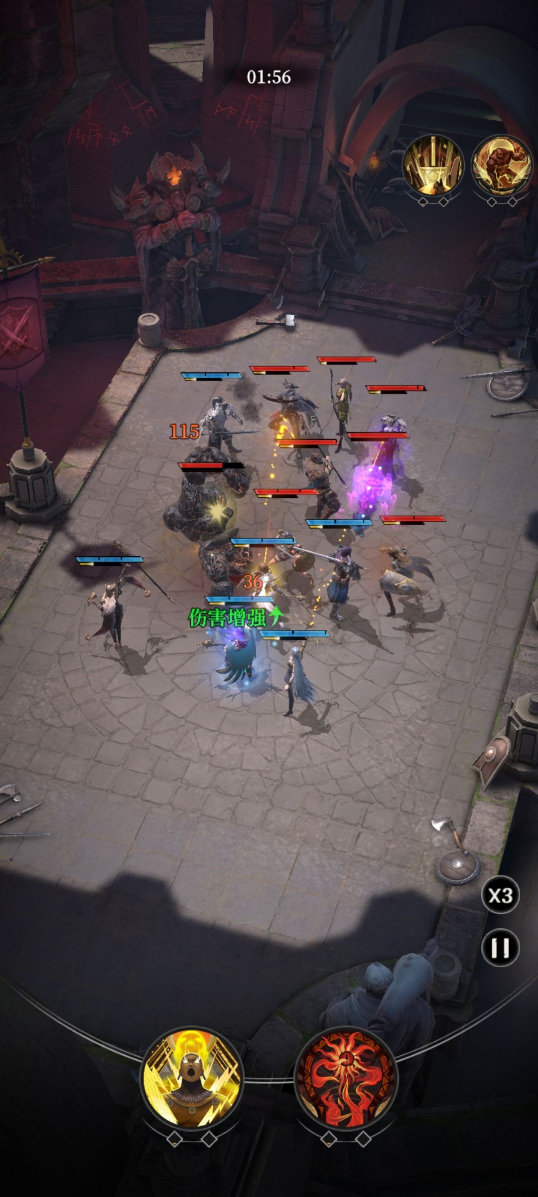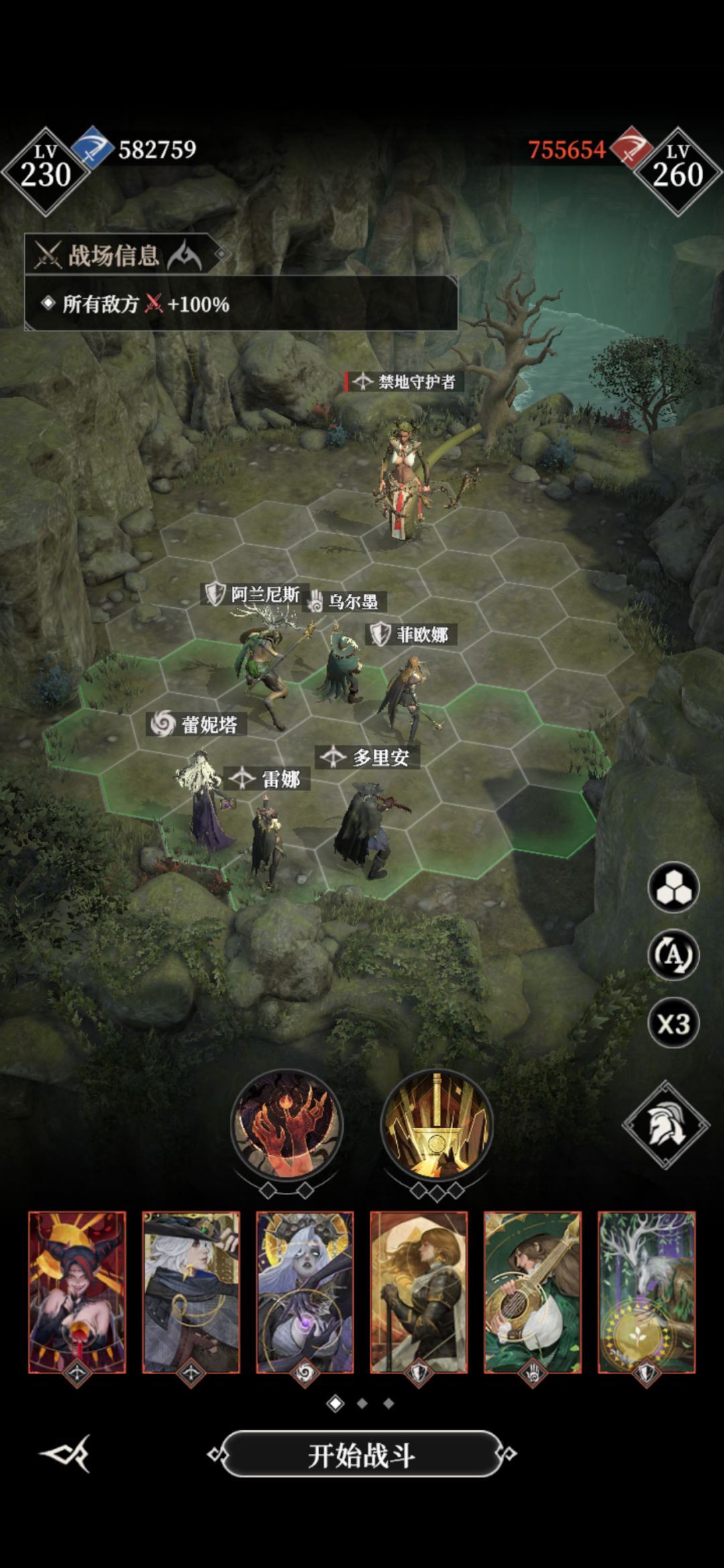 #地下城堡4骑士与破碎编年史 劫掠峭壁一年后boss 女蛮子 神力站位阵容如图 鹿头,多里安,光盾能量套 谷雨攻击2.8,夜魅多里安2.6多 开局丢恶魔给矮子 极限过,需要多试几次,锤子留着砸破了稳固的蛮子