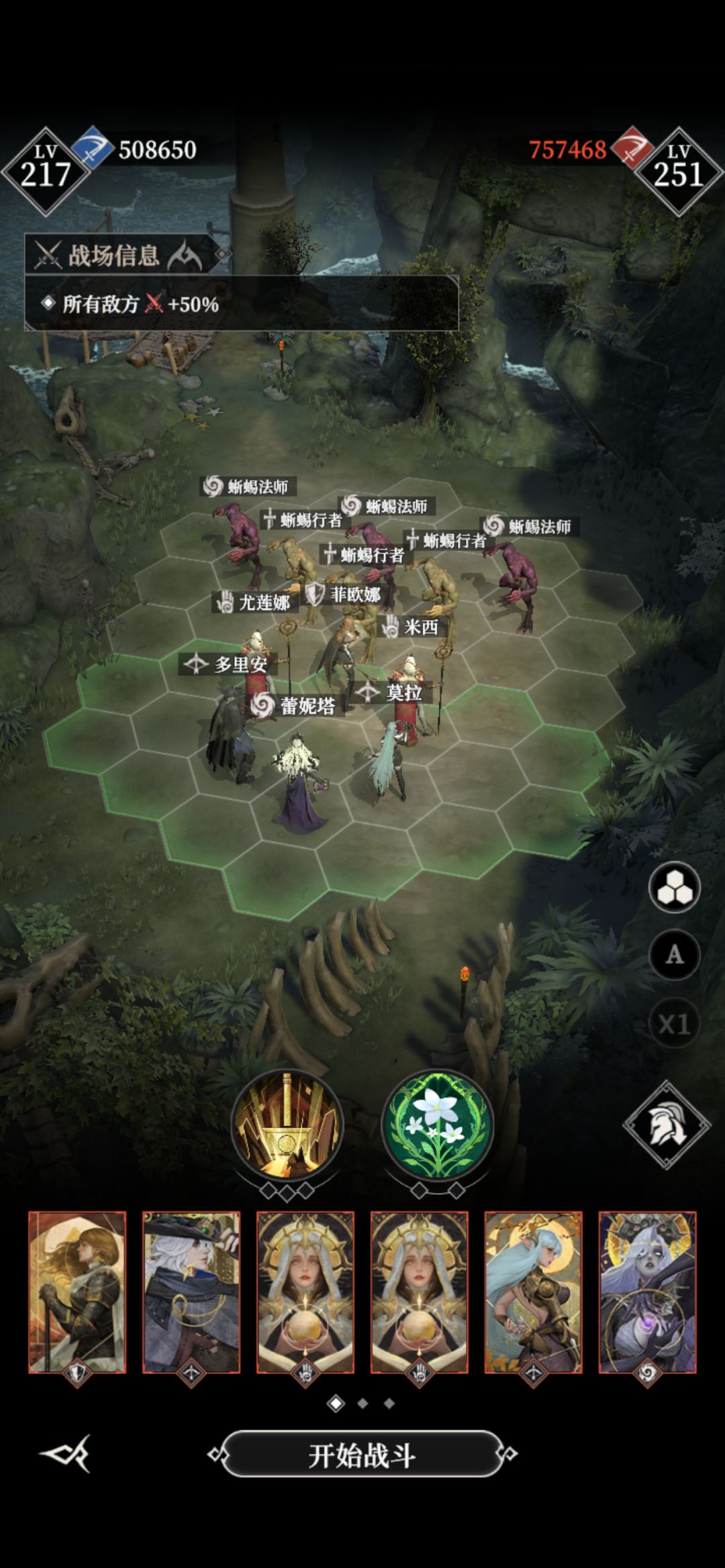 #地下城堡4骑士与破碎编年史 墓穴505 阵容站位神力如图 光盾,多里安能量套,3c2.6攻击,开局丢恶魔给光盾 多里安会打右边的后排,锤子好了给右边后排一锤子 右边的死了多里安会去左边打,然后锤子好了给一锤子