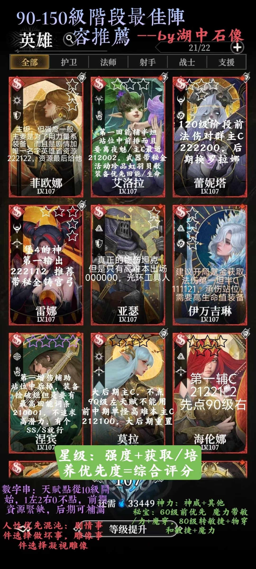 不再更新,已退游,人物削,装备削,圣遗物削。玩不下去了。 总结t0骨语讯矢 首先排除战士、奶妈。天赋左边为1右边为2,不点为0,我不建议点,没列出来的都不推荐。 1.讯矢多里安基本打boss022200前期点个30级天赋化身后排杀手,炸弹也能炸一两万,中后期专门用来打boss,不需要炸弹。 2.林地游侠022202清杂和打boss什么时候都好用,不知道上什么就用她,可以养多只。 (5.27更新,这