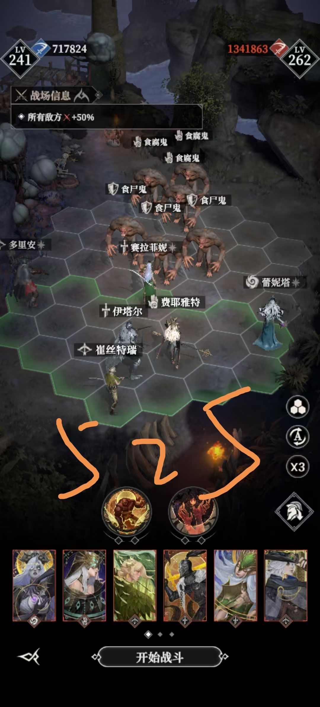 图用的是260的,原始站位参考了湖中石像的视频。为什么要变呢?是因为按他的方法我通不了,最后不得已做出微调:决定成败的是神力释放位置,如图二,石头人放在寂灭的边上,吸血鬼放在雷尼塔最左边的墓碑上,顺利的话可以实现六人围殴boss,个人目前最爽的墓穴通关。