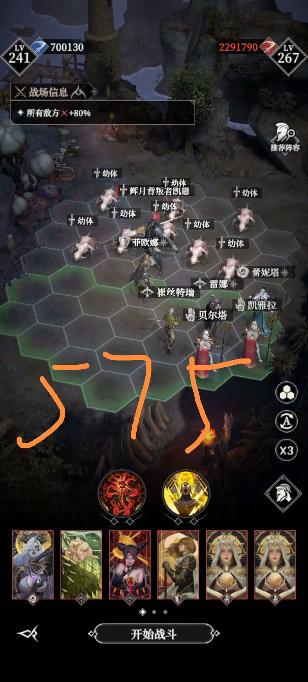 就这么一套阵容,3倍速挂机过吧。。。战力都71万了。。。。 2025年8月14日大更后,我推完了那些福利图,开始推下墓穴。就是很容易的说。。基本都是3倍速挂机过。阵容依然是: BOSS:骨女、闪避姐、黑武士、暗奶、绿弓、迅矢 小怪:骨女、闪避姐、黑武士、暗奶、绿弓、夜魅 哪怕某些关不太适合上双近身(比如540),问题是也挂机过了。。额。。。位置自己可以微调下,打小怪我基本都缩在一起,打BOSS基本