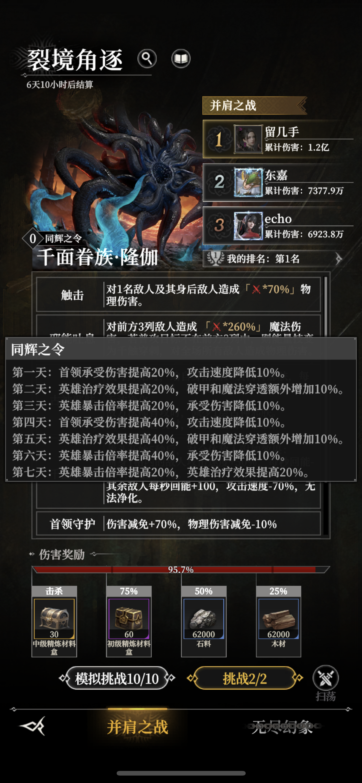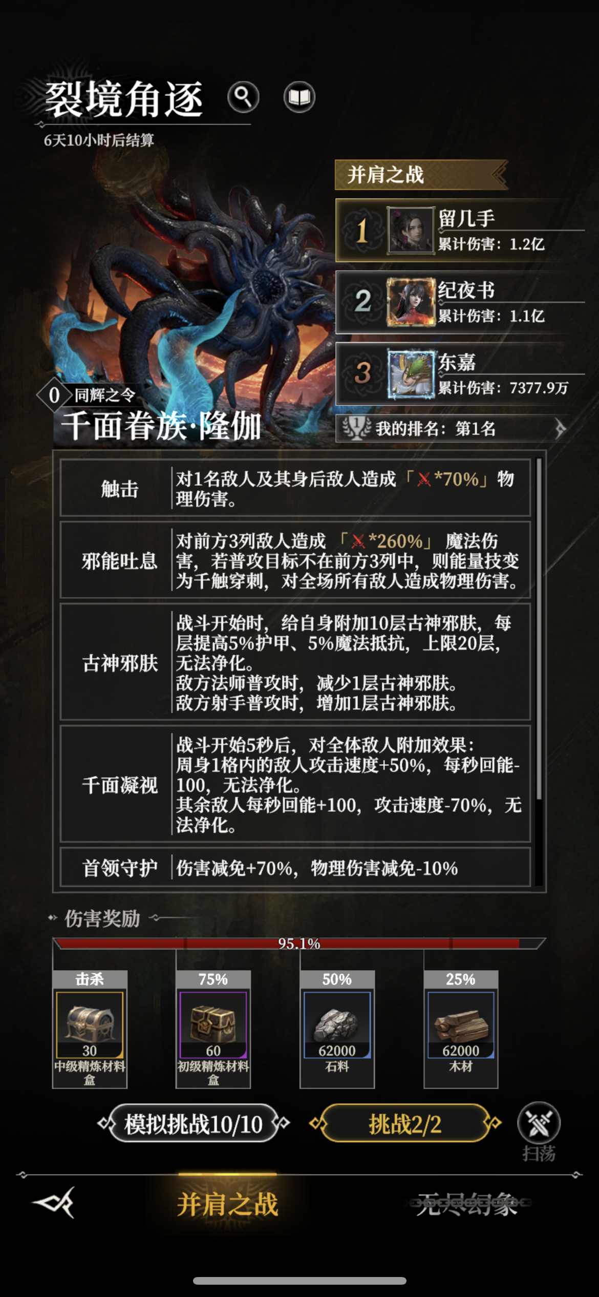 我想说:今天是第一天打这个千面眷族的并肩之战,看了一眼boss 技能介绍,还是那个味道,专门为新英雄(熊女)准备的,可惜我没抽到熊女,等下周有熊女了再出个熊女的伤害对照图。考虑到并肩之战阶段并无个人排名奖励及现在很多区的玩家不够活跃导致并肩之战阶段在7天之内很难击杀,所以出一个简单的攻略以及新一期的打法和阵容推荐,希望能帮助大家早日击杀Boss,进入到下一个阶段无尽幻象。活动简介和要记:首