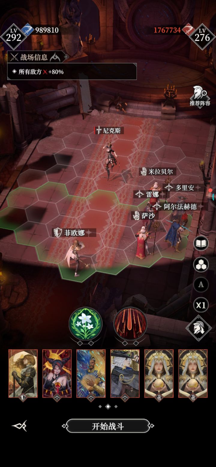 先说威力7.5,破甲14.3。这个boss只能上物理系攻击角色,如图上就行。(你要上法伤角色你可以试试)夜魅天赋2222,烈无暇2122,护从2112。神力前五管血不要放,后五管血随便放。看完了就打去吧。