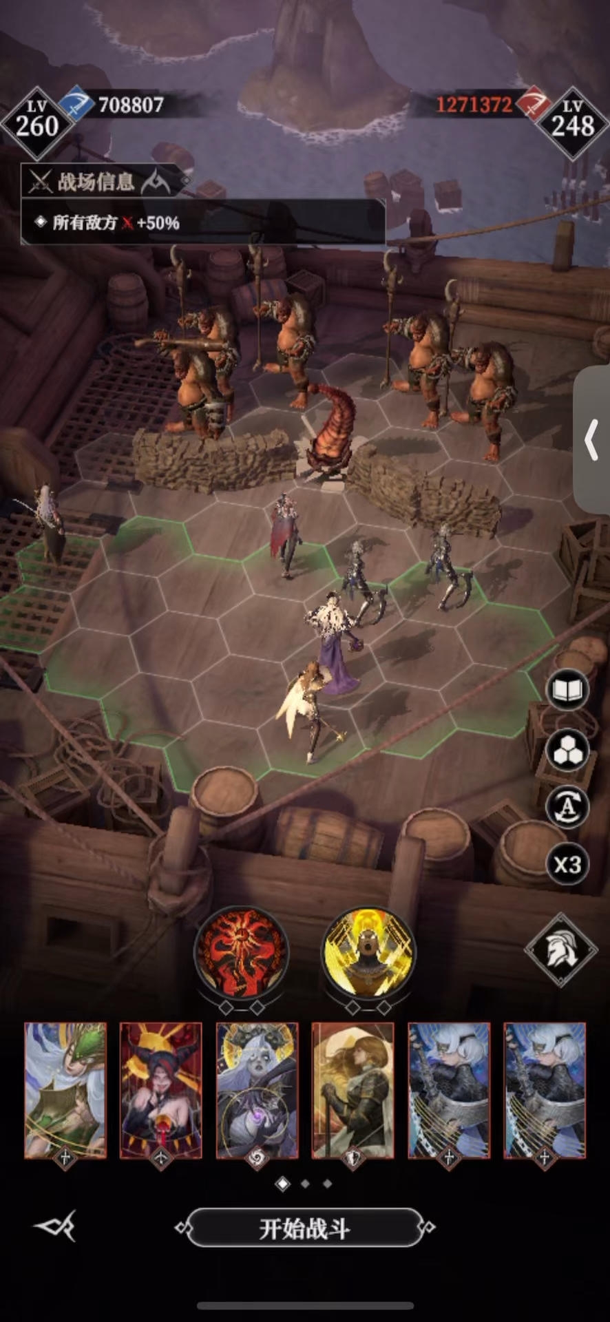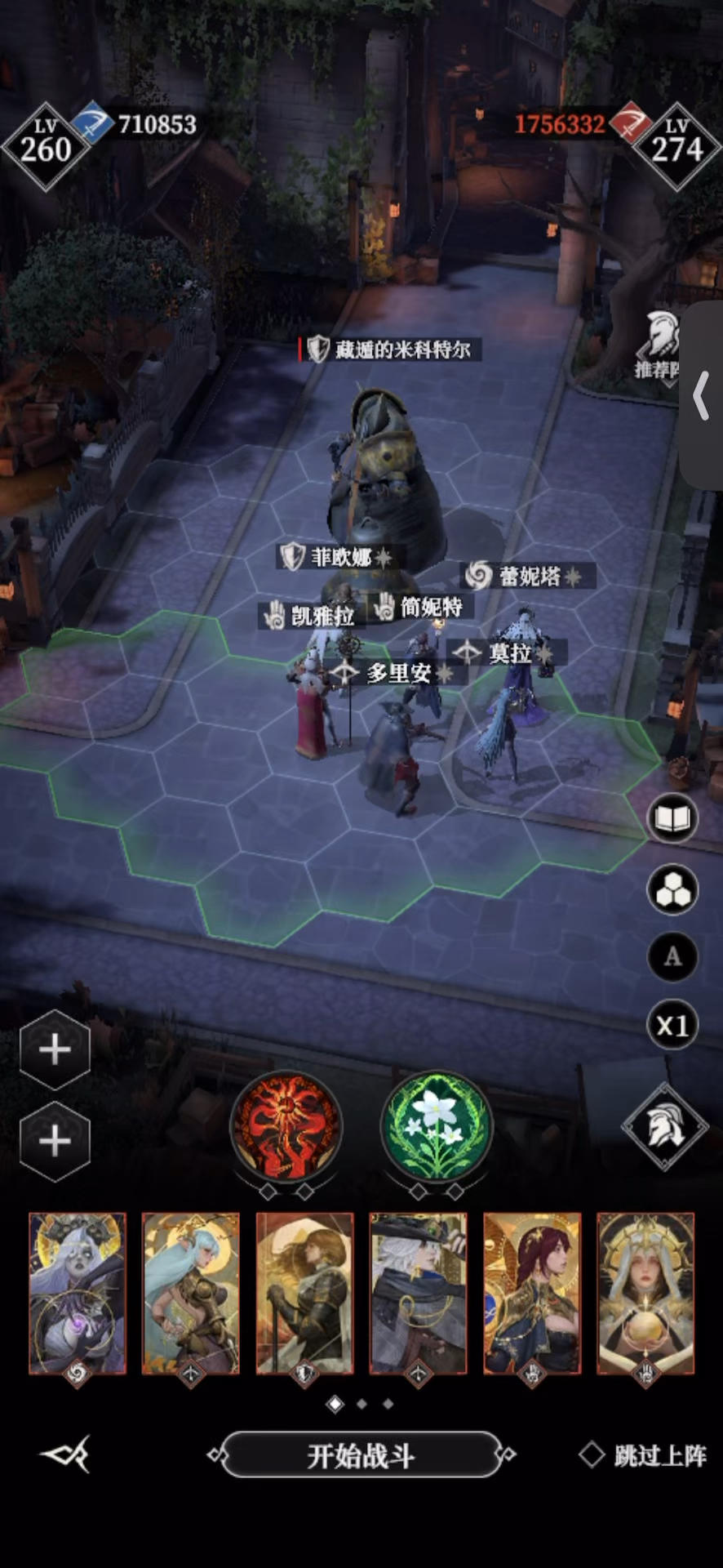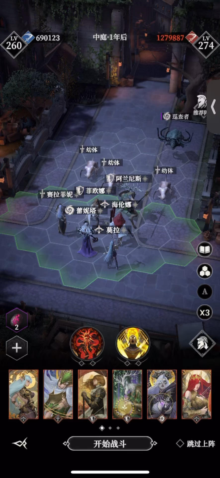 站位参考得@HALO大佬,这站位真牛 但我舍不得果子,自己改良了阵容和神力 吸血鬼+剑圣都是吸血套,其他人无所谓 🔆小tips:平时寂灭保持有三个,需要双寂灭的时候,加点给潜力最差的那个。一般情况下双寂灭就是充当换位+晕眩的功能,不指望他打伤害抗伤害。用完直接解雇那个低潜力的寂灭回收🔥。我感觉400金币省一个果子还是划算的。 #地下城堡4骑士与破碎编年史