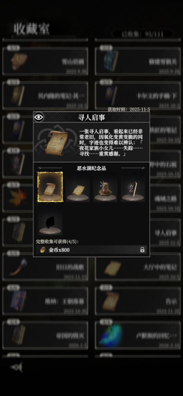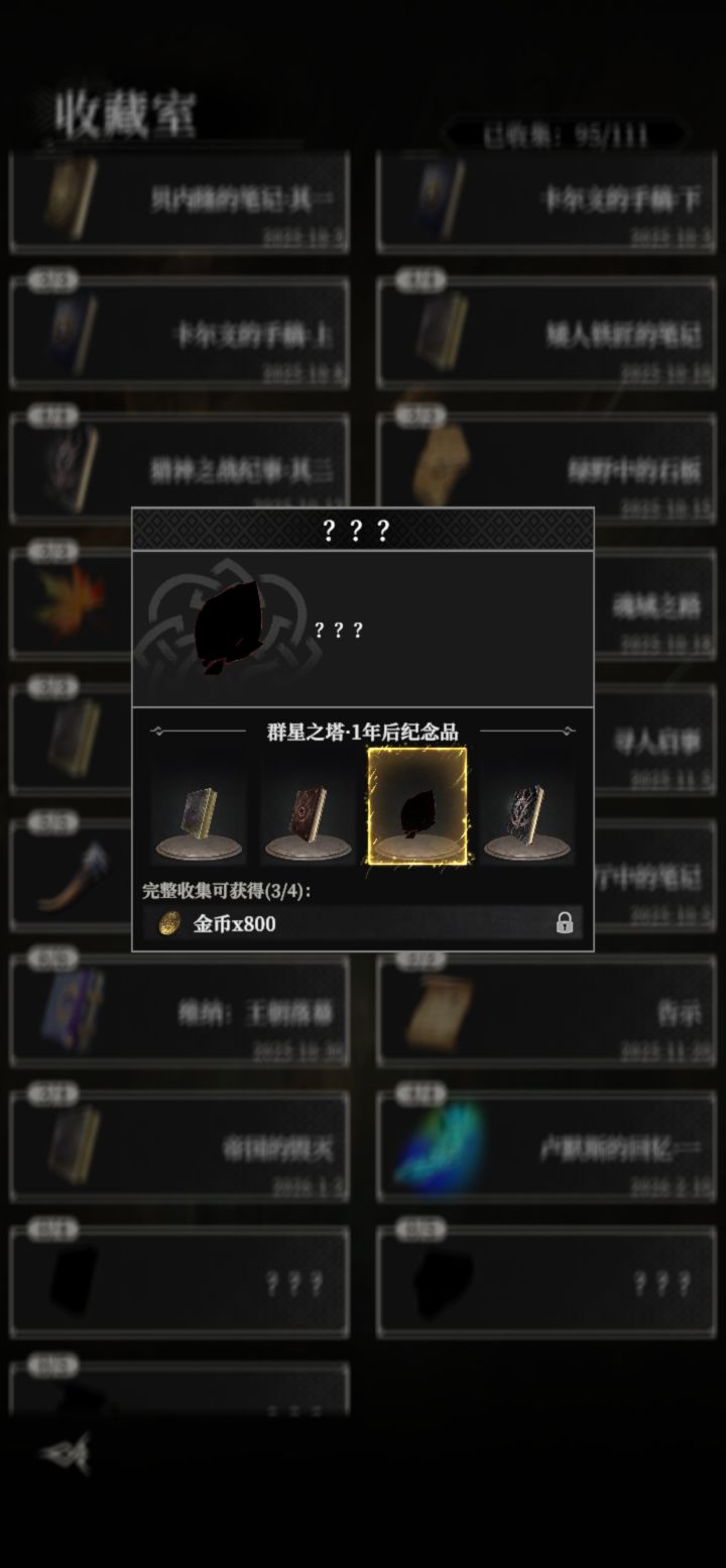 其它纪念品都有了,就差恶水湖第五个和群星之塔·1年后第三个这俩纪念品,强迫症快难受死了,有没有大佬还记得的,帮帮我。