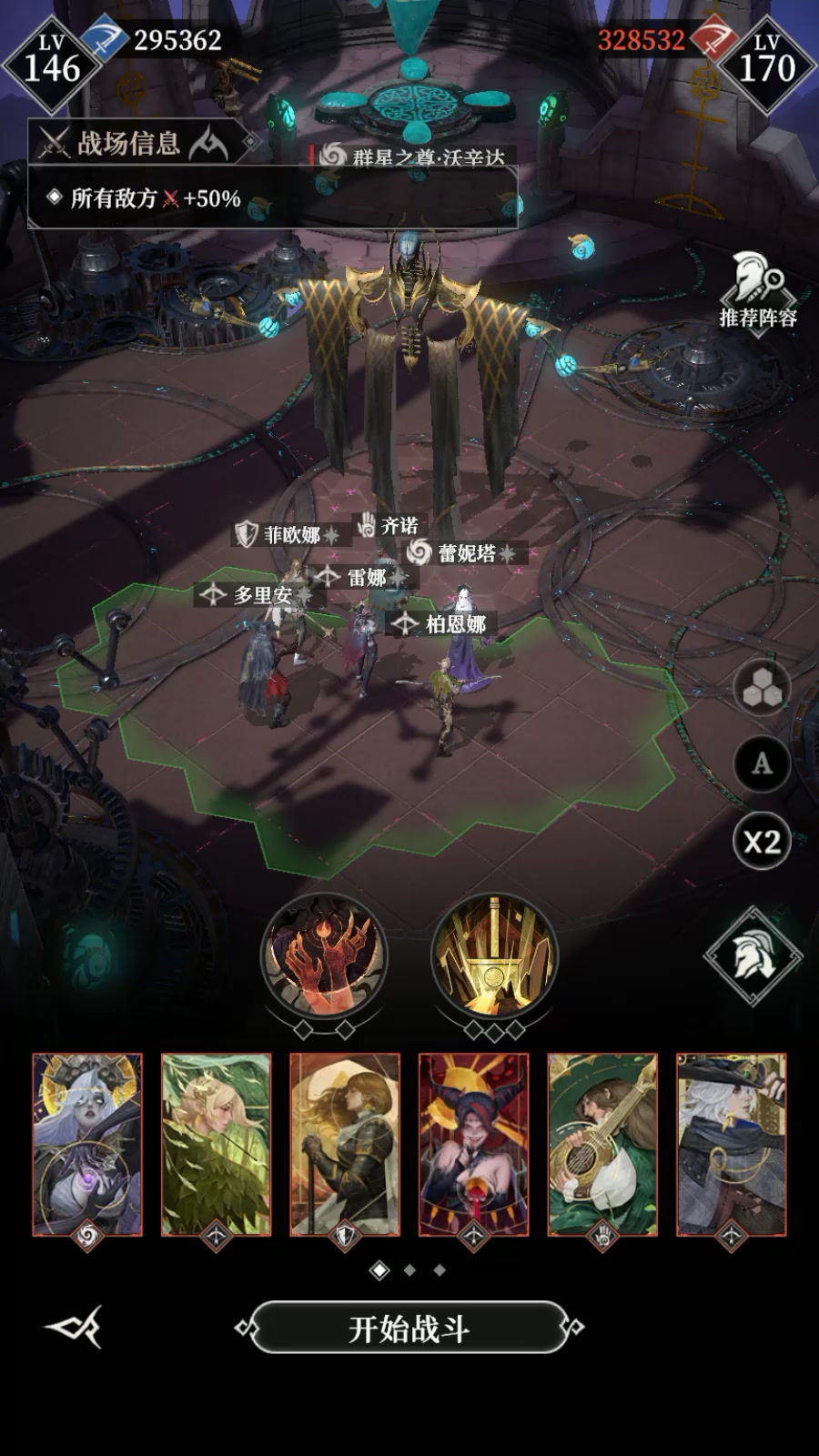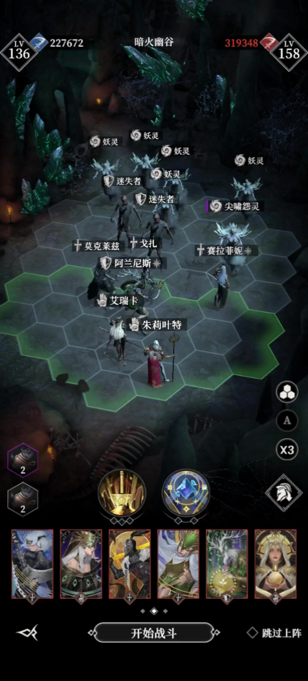 神力需要带惩戒+驱逐,惩戒至少五级,驱逐等级越高越好(低级也能打但是太凹了)。 敌人中只有boss女妖和两只僵尸有伤害,小女妖只会回血,而boss的血量远低于僵尸,所以逃课的关键就是爆发秒boss和僵尸。 没有特定需求的角色,输出位刺客或者战士都行,但是需要稍微有一点坦度,生存位随便一个坦+小精灵+圣光。 站位如图开局顶着右下角确保至少有一个角色会盯着boss打。 手动模式开始战斗: 第一步:注意