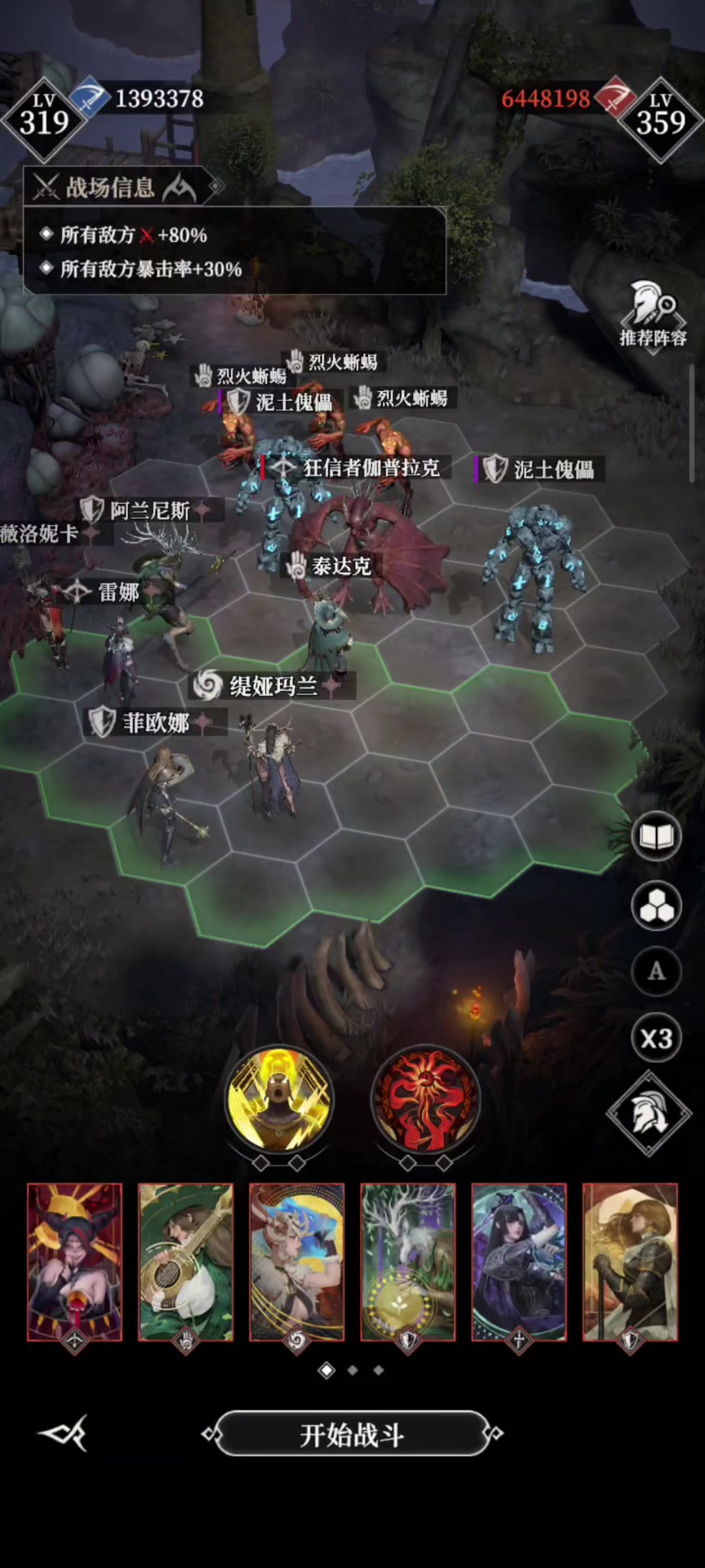 凹了两个钟头凹过去夜莺80刃,三黑骑60,鹿头矮子40,站位如图,神力自动。夜莺4.82威力,9.32破甲。黑骑4.79威力,8.88破甲。黑骑2号4.80威力,8.59破甲。黑骑3号4.62威力,8.35破甲。打法就开局给矮子一个护盾二层的石头,后面就只给夜莺护盾石,神力自动赌命了。天赋鹿头点的死后加伤害。夜莺摩尔套,黑骑1号摩尔套,23号吸血套,鹿头塞雷娜,矮子散件,装备尽量带了魔