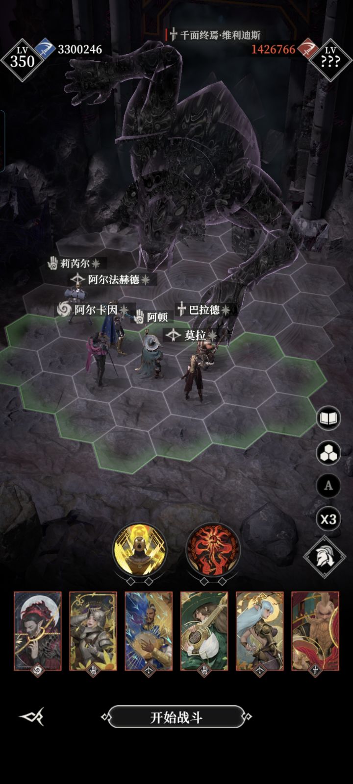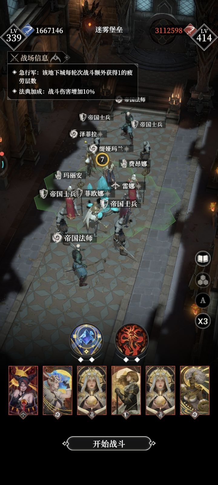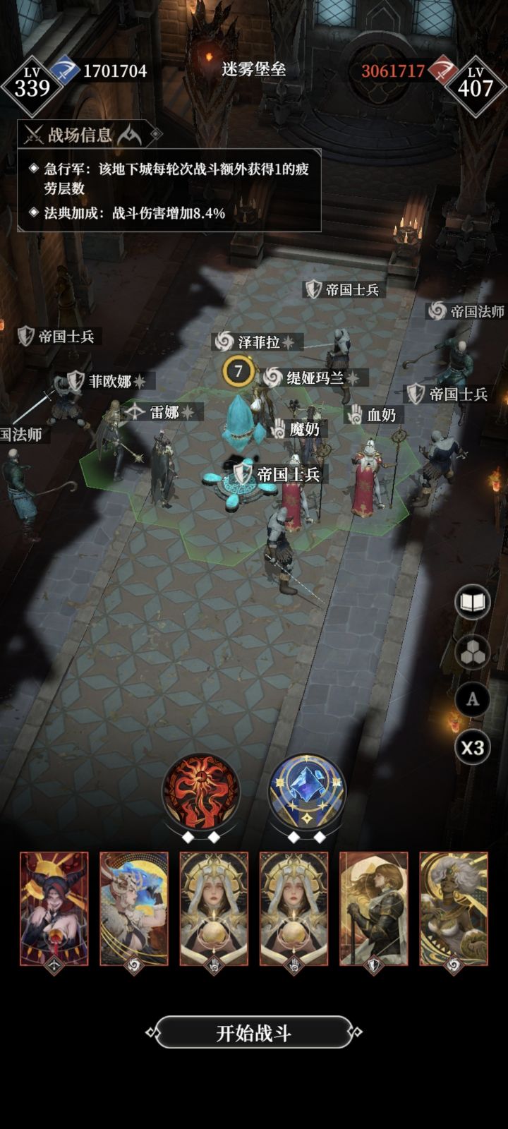 省流,6.3左右威力(只要能过战败龙的威力都够),诅咒选125910,按图中站位,事件别选偷袭和调查房间。战力低(如图1),图1图2开局第一时间加速神力给优雅杀手蕾娜,然后马上异界打死上面法师,打不死根据情况再补一发,然后等结束。战力高,开局第一时间加速神力给蕾娜,然后挂机等结束(结束前加速神力必须恢复一次,如打的太快恢复不了,建议换低威力武器再打)。图3神力回复局,开局挂机等神力回复和过关。图4