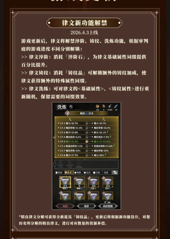 淬阶——升级。可升10级,除了两个稀有属性不会提升,再上100级火的加成,律文属性至少翻一倍。材料有点小贵(图六七)铸纹——开孔。每个律文可以开三个(图三),材料由分解金色律文获得。开孔后的词条随机(应该可以更改)。可洗练(单独洗练材料),不知道是不是随着淬阶而升级(不同步,需要不断的洗练)。洗练——洗词条数值。可锁定。材料由律文分解获得。提升不大(但还是有点提升)。很容易洗到A。个人感觉,