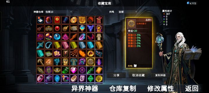 我拿到了一件超厉害的神器众神的骰子-----------固定属性: 幸运+20随机属性:技能CD-5%技能CD-5%技能CD-5%技能CD-5%技能CD-5%-----------在收藏馆异界神器中输入分享码可获得,获得的时候会随机重置一个属性,分享码: HCQspJqSjObY0lG1l7ediPyqKTGFPM/Q3yC0ctwYxEgglZbJ3ruMbPjVnX
