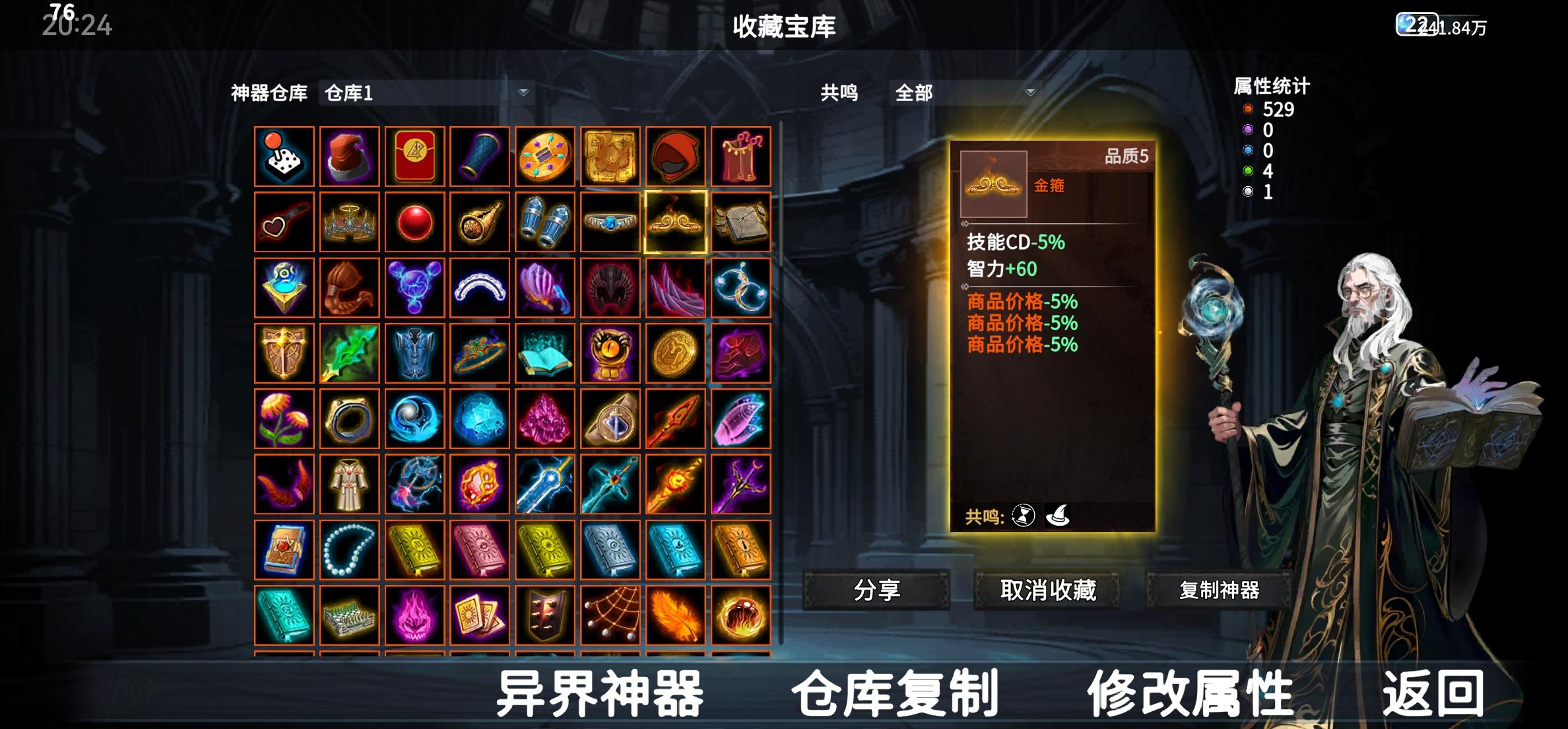 我拿到了一件超厉害的神器守护者存钱罐-----------固定属性: 存钱罐+8%敌人刷新+8%敌人移速+10%小怪攻击力+30%随机属性:金币加成+10%金币加成+10%金币加成+10%-----------在收藏馆异界神器中输入分享码可获得,获得的时候会随机重置一个属性,分享码: KNHT+kPrBMSkPKGf7FbSzmtoLKnmvmyQck2tUuXiD6