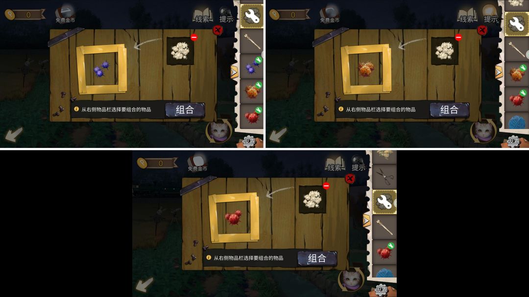 攻略作者:迷失攻略组-路人A 未经许可,禁止转载,侵权必究! 【第一章·故事一】 1.拾取消防栓附近的【剪刀】。1.1 2.用【剪刀】剪断水沟里的水草,拾取【网兜】。2.1 3.挪开花丛,切换猫视角,进入老鼠洞。3.1 4.点击老鼠,完成小游戏(将猫爪图标往下拖到底部),拾取【鸟饲料罐头】。4.1 5.根据花瓣的颜色,打开箱子得到【皮筋】。5.1 6.组合【网兜】和【皮筋】,修复网兜。6.1 7.