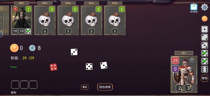3、骰子用完后结束回和,如果敌方卡牌没有被消灭则依次对我方卡牌进行攻击。每次攻击的伤害看敌方卡牌右上角绿色的槽位数值,显示多少每次攻击就扣除我方卡牌相应的血量。我方卡牌的血量在左上角红色槽位的数值。