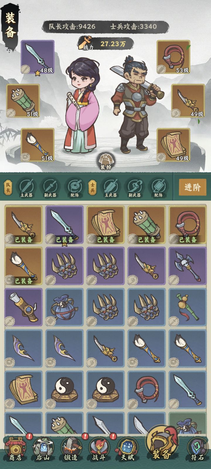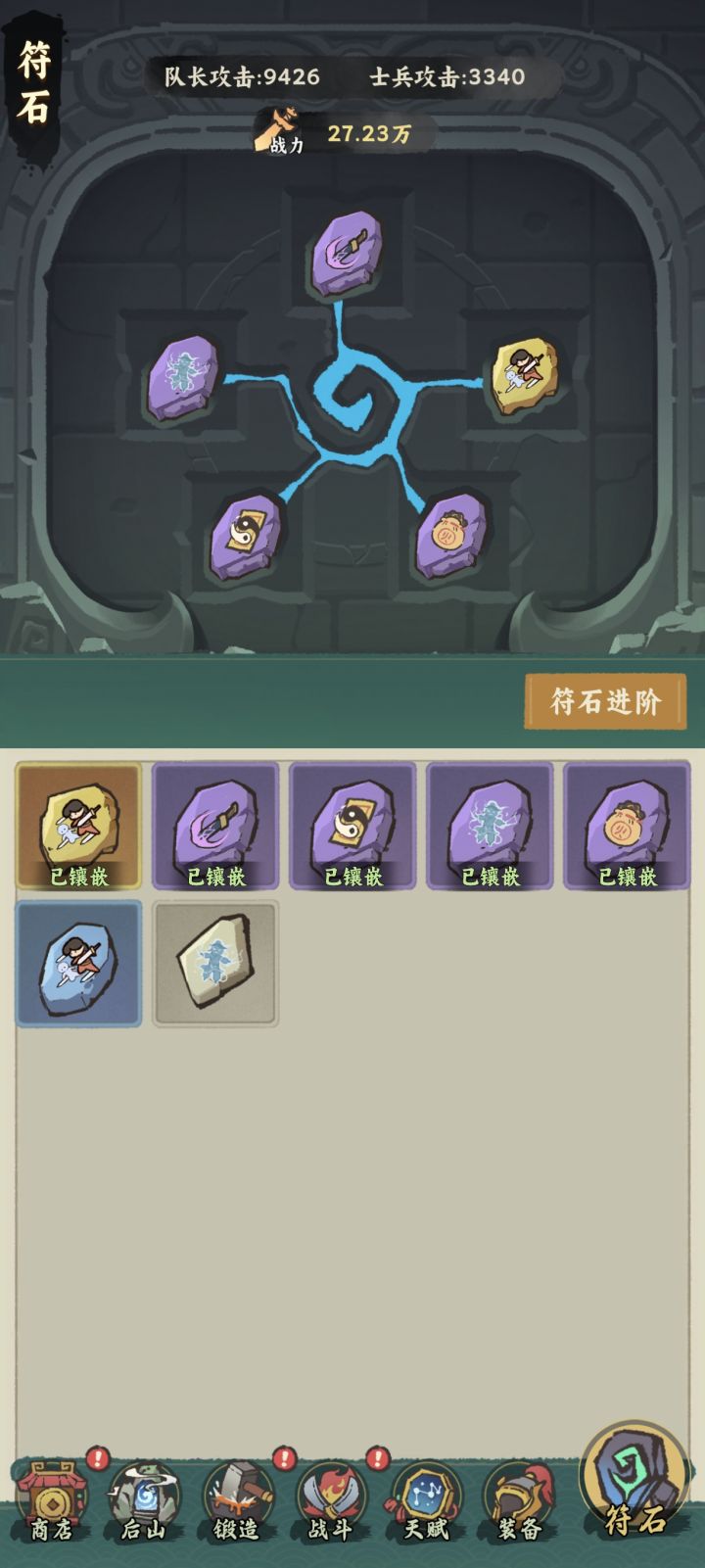 目前玩法除了主线还可以挑战关卡(就是主线强化版),还有爬塔、和后期开的狩猎和占地,总体说玩法还是比较丰富的,人物强化类有装备、符石、天赋、神器、战宠,装备、符石就是正常的三合一,种类很丰富,后期可根据自己喜欢的技能属性来更改,天赋就是正常强化子弹(士兵和将军),神器目前看来是每回合有效果,战宠我暂时还没开。