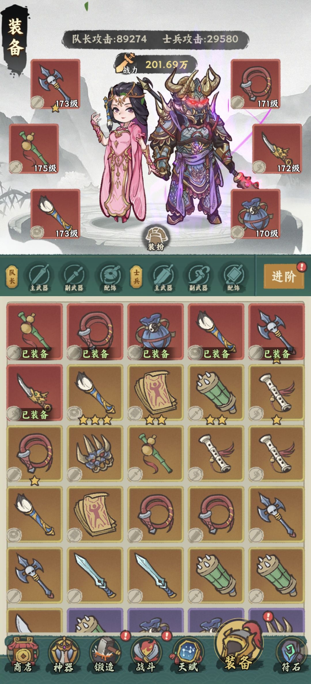 仙品装备进阶:10石头—灰色—25石头—绿色— 50石头—蓝色— 80石头—紫色 —2个紫装 —紫色二星— 120石头 —橙色 —三个橙装— 橙色三星 —180石头 —红色 —5个红装 —红色5星 —250石头—彩色。 仙品装备有点废金条,但是融合了该部位三个装备的词条,自己还有独立的词条,还是很猛的。建议月卡和微氪可以先做普通装备,金条留着去搞一下转盘抽神器,转盘许愿符石,等装备全都橙色,神器