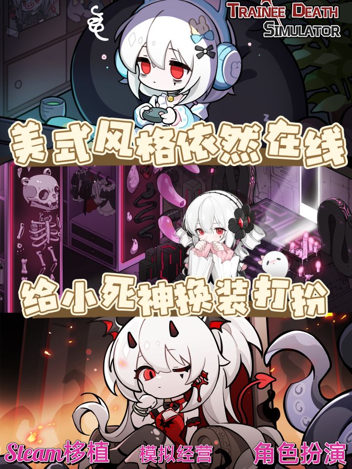 模拟死神决定他人生死,小死神还有多种装扮~复眼死神/JK萝莉/禁忌修女/炼金术师,你最喜欢哪一种呢?未来至少有十件装扮!泳装已经在计划中啦~期待期待~目前试玩版仅在steam上,中文名称叫做《死神模拟器》#宝藏游戏安利派对 #游戏安利 #游戏推荐