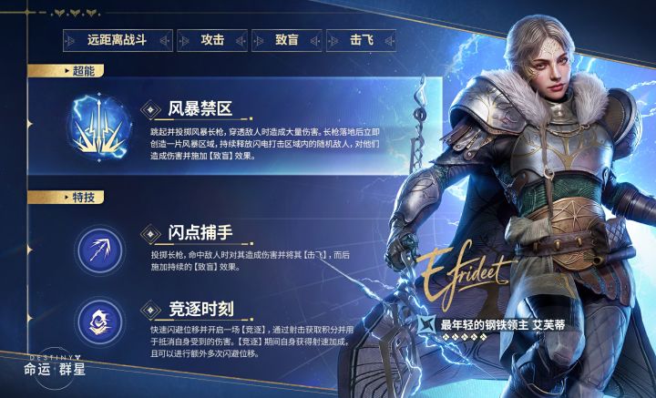 她引导电弧之力,以闪电长枪标记猎物,将战场化为狩猎场。每一次命中都在积攒“竞技优势”——让专注化为纯粹的力量。时机成熟时,她从高处降下雷霆风暴,宣告对这片领域的掌控。迅捷、精准、无可阻挡——她不为疆土而战,只为更美好的明天。#命运群星