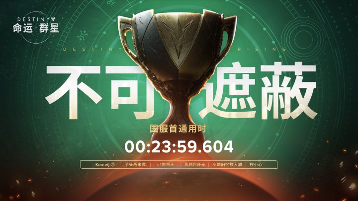 来了来了!机灵很高兴的宣布《命运:群星》「不可遮蔽」副本国服首通火力战队!!!恭喜他们!火力战队:Komeiji恋 芋头西米露 k1肘击王 我独自升光 空城旧忆故人離 柠小心首通用时:23:59.604——————————————————————————“首周竞速终极挑战活动“仍在进行中!速通冲榜时间截止至11月10日00点05分,冲榜阶段截止后将为全服个人排名前600名的负光者奖励:动态