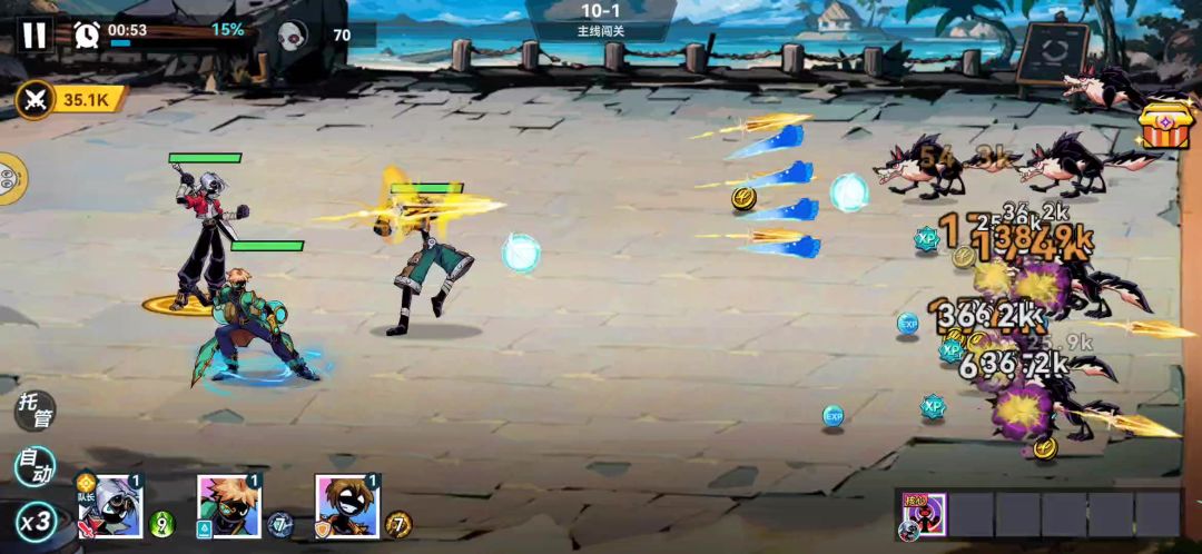 给新人的一点建议,1,商店里看到紫卡碎片不需要犹豫,马上买,需求量比较大2.这游戏的坦克和治疗都很重要,目前没发现战士的闪光点,刺客的流血技能很牛逼3.装备有了就可以升满级,级数是可以继承的,4.你想长久玩下去的话,建议充个68元永久卡,可以去广告,在此强烈建议官方把三倍速也加入永久卡这边,或者免费开通三倍速,我现在玩到第七大关,刷一局就要十分钟,把体力刷完基本要一个小时,这样会消磨玩家玩