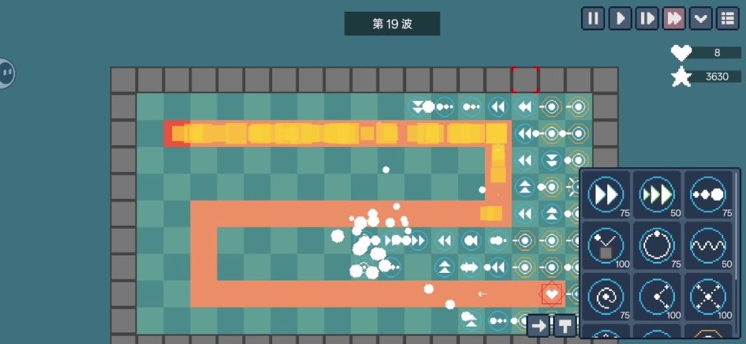 开局先建框起来的三个,能挺上三四波。可以先可以先建加速道。子弹变大是为了让其在加速后可以被反弹。感谢“从第0开始的无敌体验。”大佬讲解的各个炮台用途。