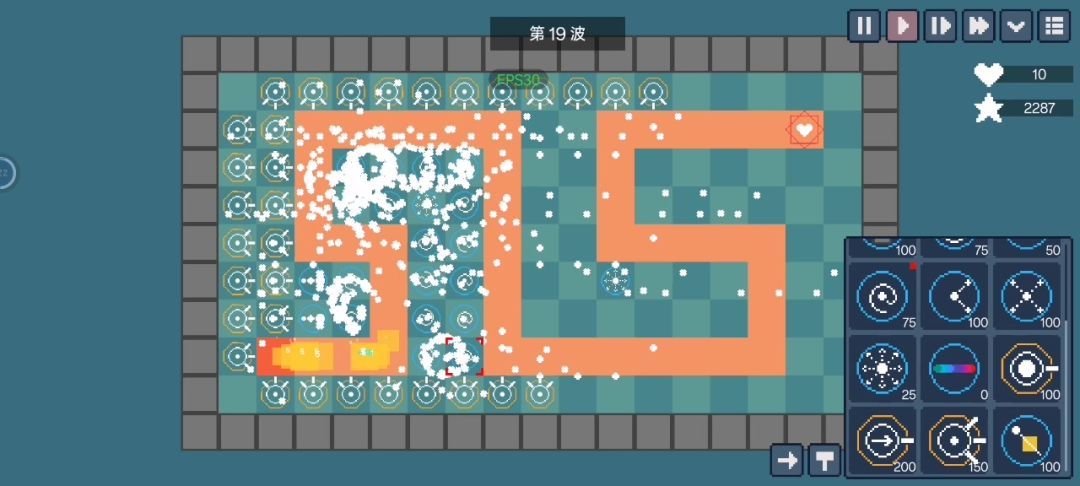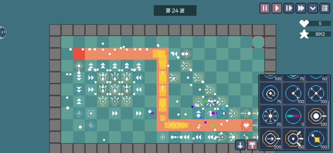 看下左边那列向下旋转后向右的效果是一次打击多个?吗#魔法塔防 #noita 如果有知道这个在noita中是什么的也可以评论。