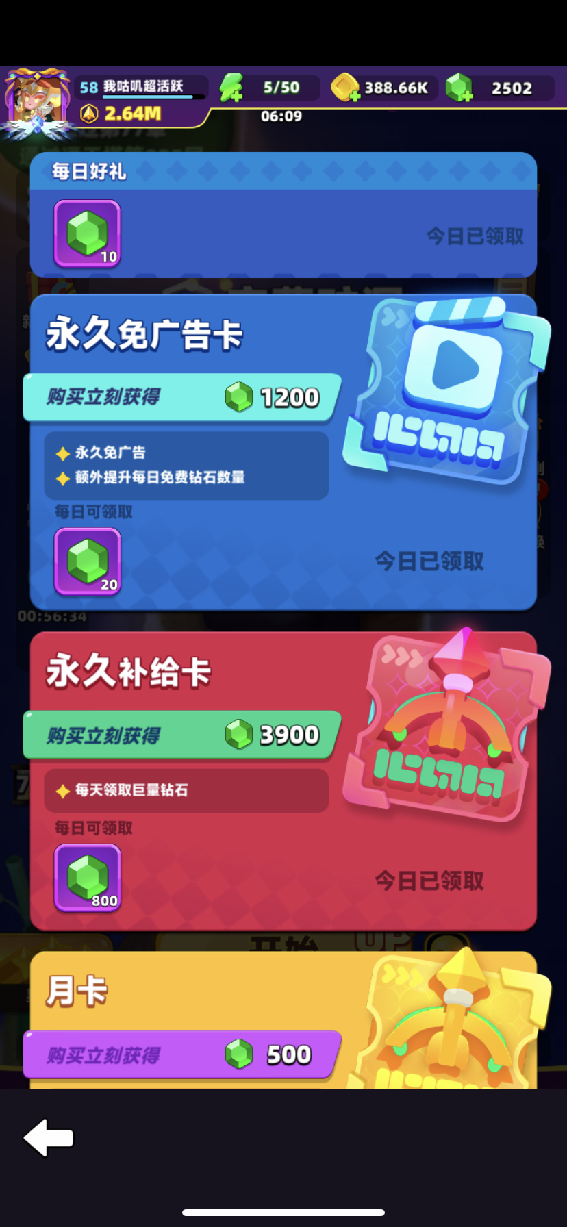 为了让更多萌(niu)新(ma)对弓箭传说2的了解,特此开贴。首先本文分零充,微氪。重度氪金玩家不用看帖,直接拉满就可一、各种特权篇1.永久免广告卡:顾名思义,就是免去一切广告直接获得对应奖励,包括死亡后复活,日礼包周礼包月礼包等。(个人斟酌,时间充裕点了广告手机丢一边30秒即可)2.永久补给卡:每日可领800钻,直到游戏关服,早买早享受。(推荐时间党入一个,钻石主要来源)3
