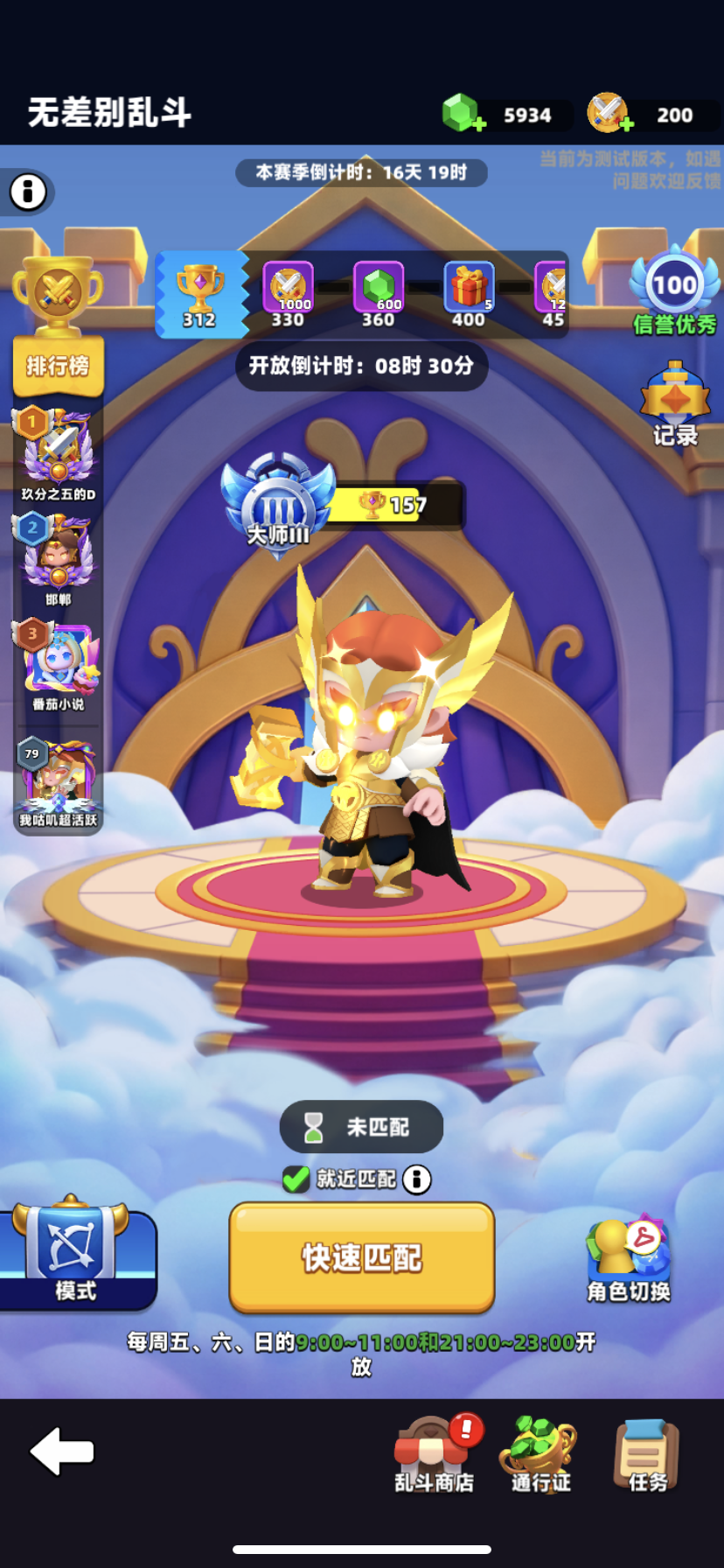 简介:分为乱斗以战力折算属性,和无差别大家一样属性两种模式。推荐角色:忍者猫,雷神,火女,冰女,吸血鬼推荐天赋:无敌局内技能:攻击,攻速,移速,加血,冰精灵,冰箭,火箭推荐打法:1:150杯以上第二名以下扣分,每天第一场免扣并加5分,可以先用最高杯角色打一场,至少加5分。2:连续第6名系统会匹配到全英文名玩家,别质疑均为人机