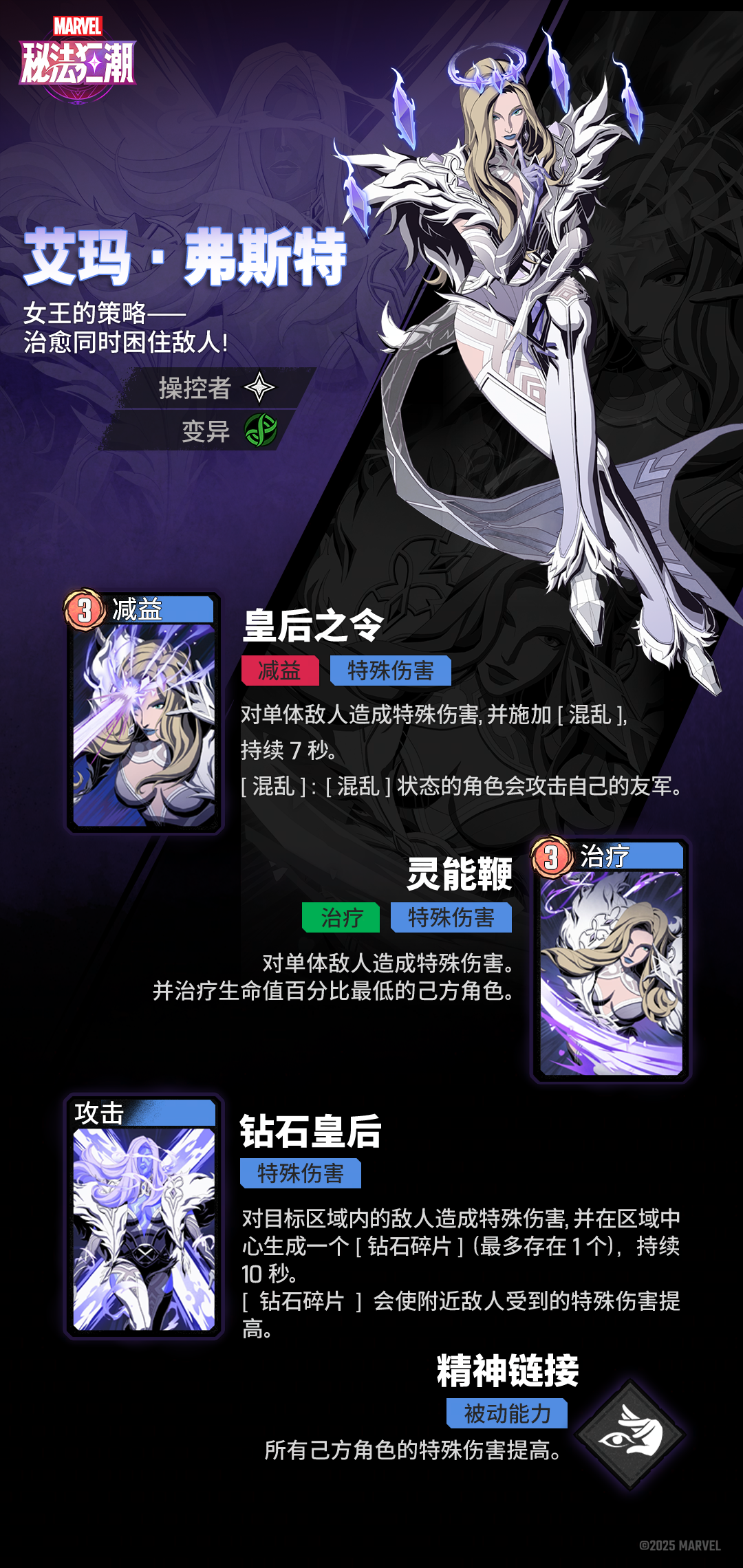 「舞台焦点当然属于我!」 ——身披钻石铠甲,以心灵感应穿透万物,指尖凝结的晶体如同她洞悉战局的锐利智慧。这位地狱火俱乐部的女王,既是无坚不摧屏障,亦是梦境怪物们避之不及的“白色死神”。 预约公测,即可获取超级英雄灵蝶、限定头像、暗影之钥、技能材料自选箱等丰富好礼! 预约请戳:https://mmm.163.com/ #漫威 #漫威秘法狂潮