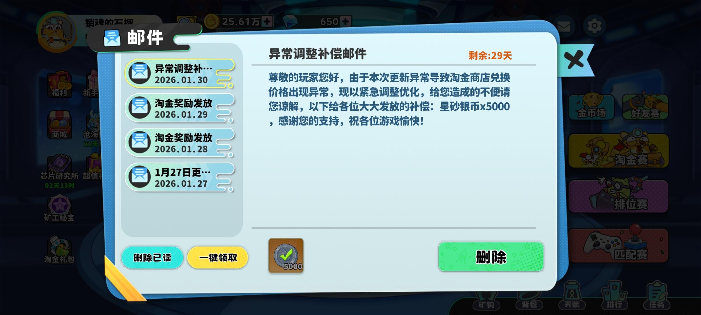 各位亲爱的玩家: 为优化游戏体验,提升淘金赛玩法趣味性与平衡性,游戏将于【2026 年 1 月 29 日上午 9:00~10:00】进行闪断更新。更新期间若出现游戏掉线情况,点击重连即可正常进入游戏,本次更新不影响玩家正常游戏体验,感谢大家的理解与配合!本次更新内容:1.淘金商店新增多款可兑换道具;2.淘金赛目标解锁新档位,挑战更丰富;3.优化调整淘金赛星砂银币获取规则;4.调整淘金赛