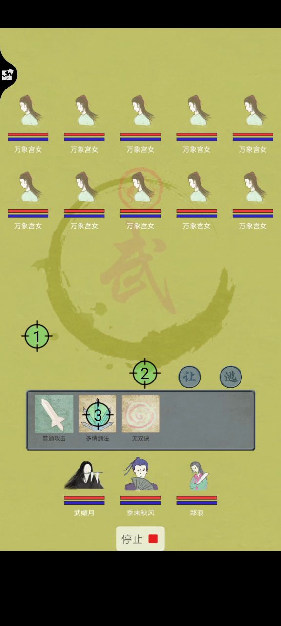 运气不错,打最后一关的时候对面没放技能,直接主角加武媚月过了