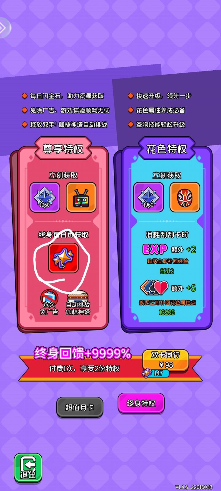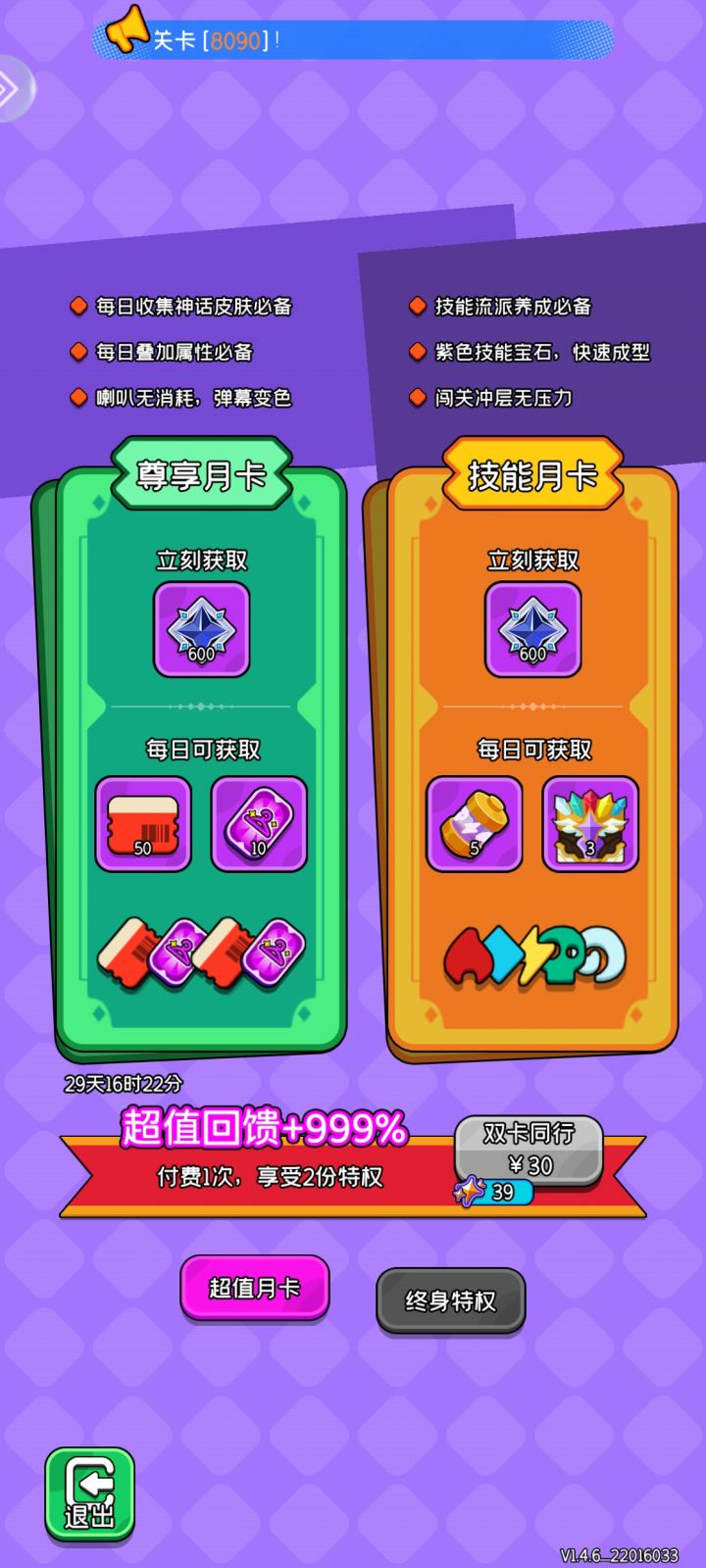 你这月卡用处也不大呀!特别是到了后期基本就没用了,还有这终身卡简直不要太抠搜。这个月卡用完就再见吧!🙂