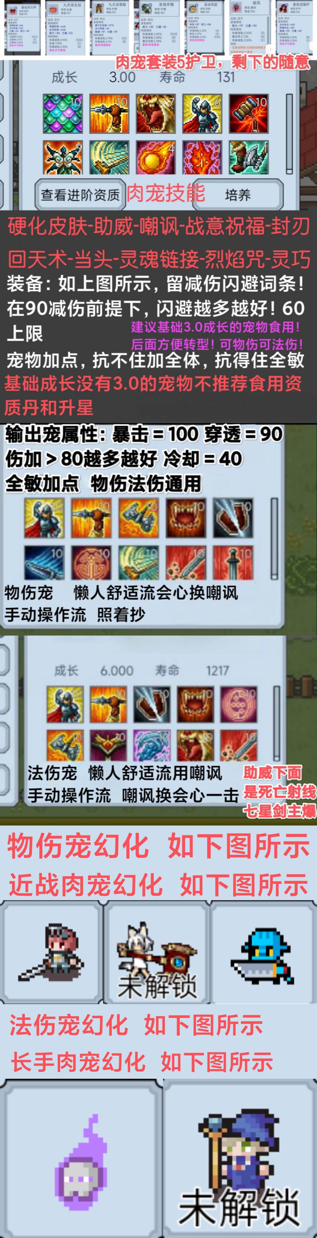 作为20s剑3,通关49层试炼塔的萌新,我觉得可以聊聊现版本的宠物了 在我看来只分为两种宠物,一种是前中后期都能玩的(包括打塔)-辅助型宠物,另一种是竞速剑3还有刷日常用-输出型法宠 强推辅助宠养成: 推荐抓一只亡灵弓箭手(手长更快拉好仇恨,方便近战职业躲试炼塔的横雷雷),敏捷体耐高的,2.9成长+即可 前期扛不住伤害全体质加点,扛得住就是全敏加点提高上debuff几率,1.49版本后尽量堆满90