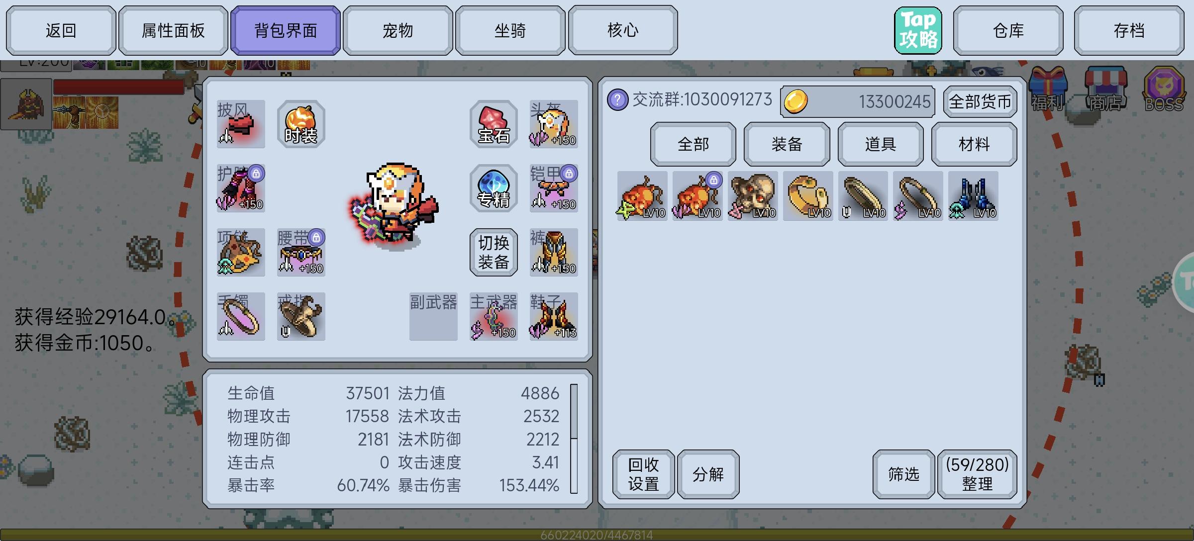 3件首饰还没有升级(全10级),衣服鞋子满级了(190),就是打起来慢一点而已。宠物全靠技能回血(嗜血+会心一击,真伤回血真猛),有法伤转成物伤,基本一下就是1000~2000回血(会心一击+暴击回血更高),改天试试把体力换成敏捷,攻速增加后不知道宠物能不能把血回满上来