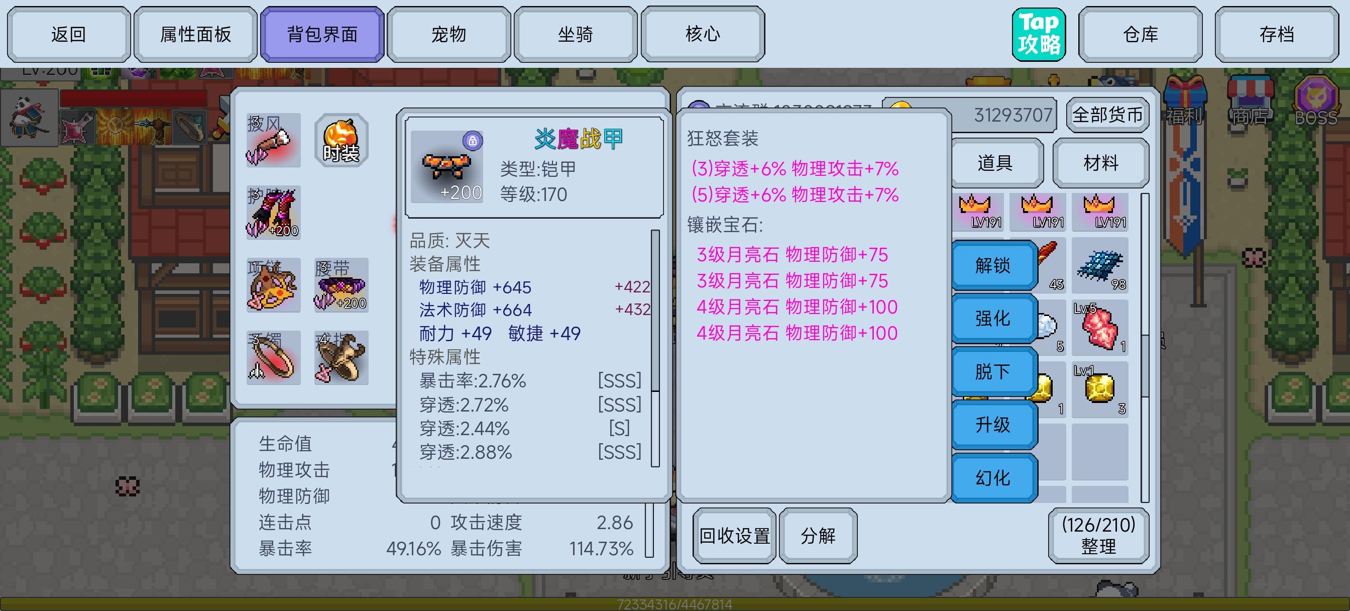 3件首饰还没有升级(全10级),衣服鞋子满级了(190),就是打起来慢一点而已。宠物全靠技能回血(嗜血+会心一击,真伤回血真猛),有法伤转成物伤,基本一下就是1000~2000回血(会心一击+暴击回血更高),改天试试把体力换成敏捷,攻速增加后不知道宠物能不能把血回满上来