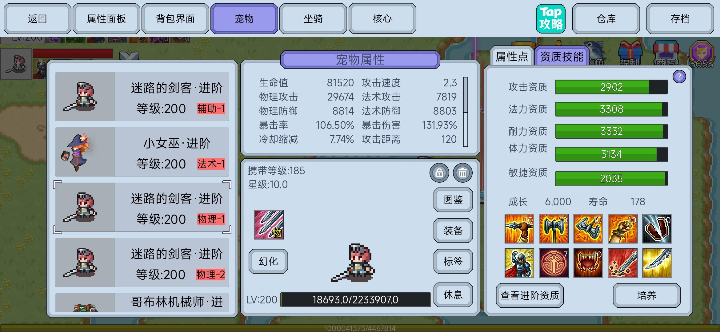 作为20s剑3,通关49层试炼塔的萌新,我觉得可以聊聊现版本的宠物了在我看来只分为两种宠物,一种是前中后期都能玩的(包括打塔)-辅助型宠物,另一种是竞速剑3还有刷日常用-输出型法宠强推辅助宠养成:推荐抓一只亡灵弓箭手(手长更快拉好仇恨,方便近战职业躲试炼塔的横雷雷),敏捷体耐高的,2.9成长+即可前期扛不住伤害全体质加点,扛得住就是全敏加点提高上debuff几率,1.49版本后尽量堆满90