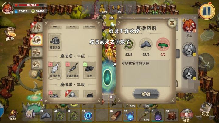 (因为没玩单人模式,所以就只能说说组队模式,重点强调,组队不能见面,只能复活队友和交换物品。复活队友点击头像就可以复活,复活需消耗复活药剂,复活契约是单机模式使用)1.选择建家位置:首先收集材料把塔升到一级,然后就可以携带,我们先把塔收起来。然后带着塔找个地方安家,路上多收集藤蔓做个背包安家建议把家在这个地方,这样可以省去建围墙的步骤,传送门对于石化期不能出远门的问题也能解决。只不过找这