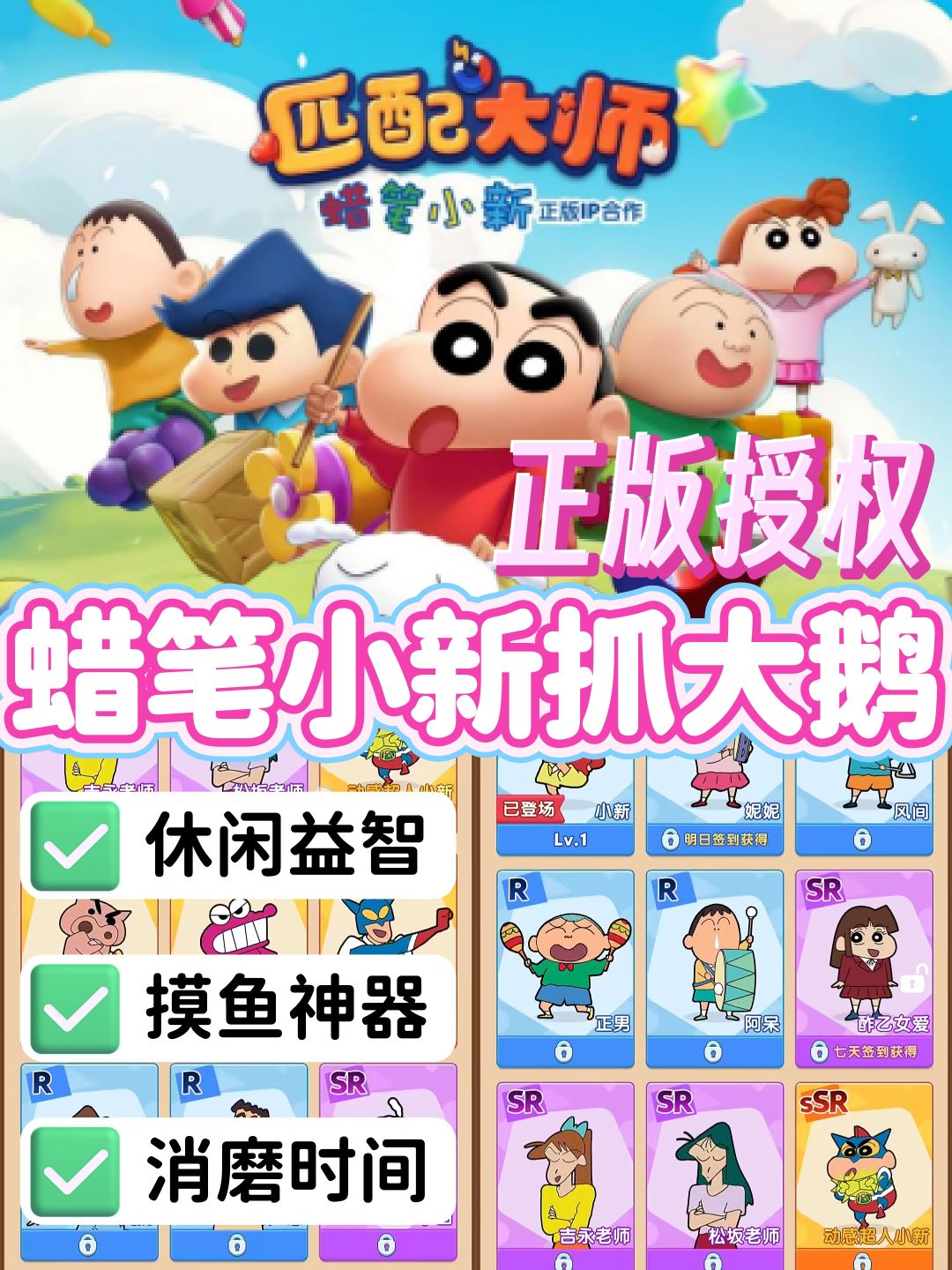 🎮游戏类型:休闲、解压、摸鱼 📸什么⁉️蜡笔小新也有抓大鹅的玩法啦😍这次我们要帮助小新收拾好他的玩具,完成妈妈布置的任务噢在 🗿不同的章节中还能收集星星解锁不同的场景以及伙伴!每位伙伴都会有不同的能力,帮助我们更快的收拾玩具。游戏内还设有pvp玩法,进行玩家对战😎看看谁才是收拾玩具的王 #游戏推荐 #匹配大师 #游戏种草计划 #摸鱼游戏