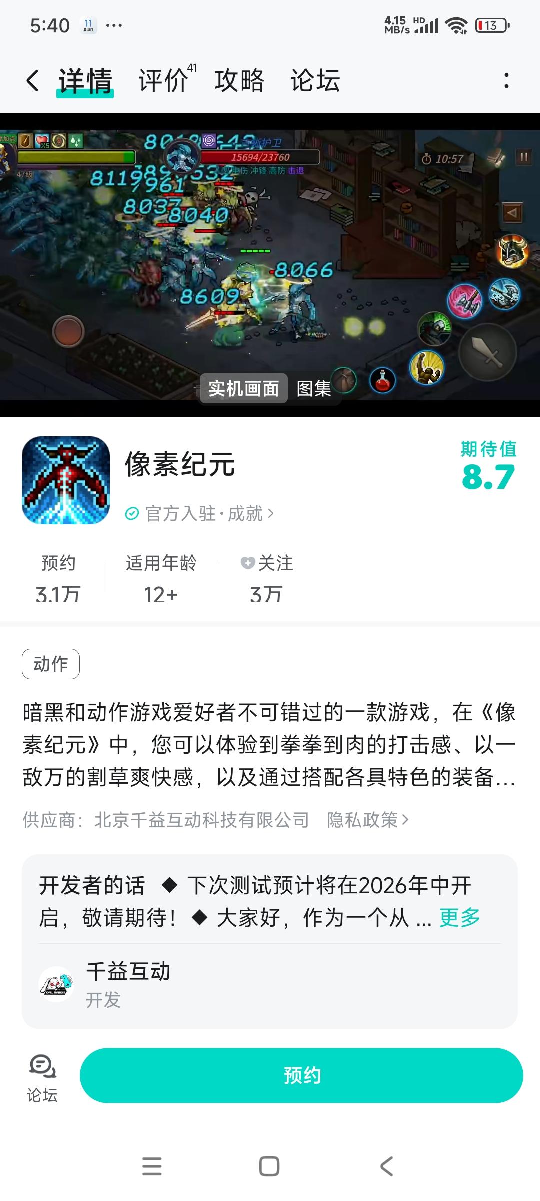 亲爱的冒险者们:经过无数个日夜的奋战,《像素纪元》终于要迎来首次小规模玩法测试!在此,我们怀着激动又忐忑的心情,邀请各位勇士率先踏入这片8bit的黑暗大陆。【本次测试说明】测试时间:6月28日9:00 ~ 7月12日9:00测试性质:早期技术、玩法验证删档测试测试目标:验证核心玩法循环(刷宝/Build/打击感/爽快感)测试小贴士:✓ 遇到Bug?欢迎吐槽反馈✓ 觉得某件装备太弱/太