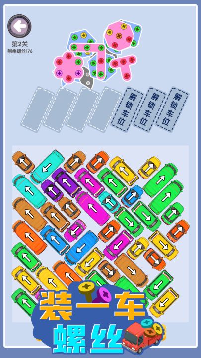 这是一款把螺丝装上汽车的益智游戏,游戏中玩家需要指挥车辆,把木板上的螺丝装入汽车上,每个螺丝有不同的颜色,需要装入对应的汽车才能让车离开,快来挑战一下吧。