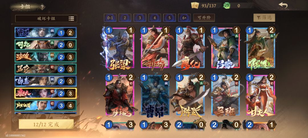 更新了一次,好事,削弱了神刘备。别的卡组能够一战了。女将流,破坏流,动物园,弃牌等等都还不错。 破坏流思路是带了典韦针对动物园,且能够杀自己的曹昂buff友军,带了卧龙诸葛限制对面的主力登场技能,别的操作就是根据费用破开周处[表情_吃瓜],七擒孟获,养肥贾诩,减费董卓。 贴上本人用的破坏流卡组,如下 -# 夺帅卡组: 破坏卡组 -# 卡背: 0 -# 卡组内容: -# (1) (曹昂) -# (