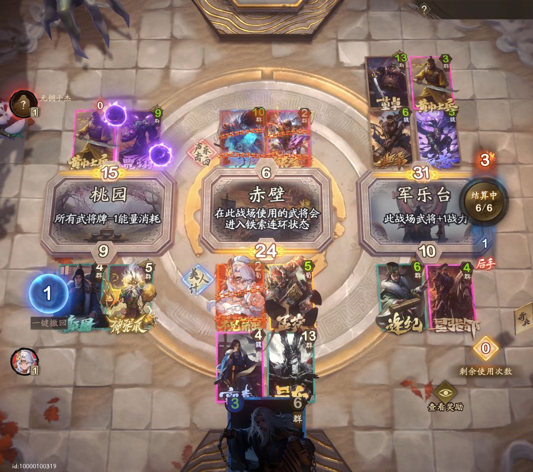 #夺帅攻略 #夺帅 上文介绍了铺场内破坏轴奇兵牌的选择推荐以及核心打法思路,接下来我来给大家讲解一下这个卡组的对战场的把控以及操作难点 战场把控: 1.起手跳费:起手有马元义或者比较多二费时,可以加倍三战场跳费,加快铺场; 2.卷土重来的释放对象:铺场需求大的时候,如果前两轮有张宝,直接张宝卷土重来;铺场需求小的时候,如巨鹿和减费战场,卷土可以给袁绍张鲁; 3.抢夺未知战场,前三轮有李儒的话,可