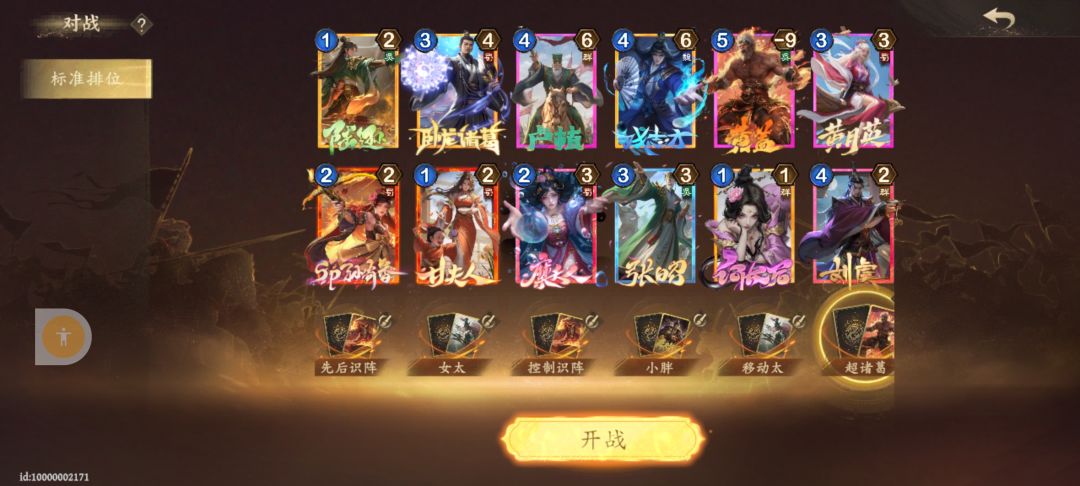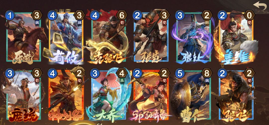 开局乐进保证不会卡手,辛宪英看情况用(自己很少用),黄月英杜预抽牌,关羽曹操稳定打4-8场,张辽反神刘备关羽,马谡可以第四回合恶心下。 奇策选双管,美女都可以,不是很完美。