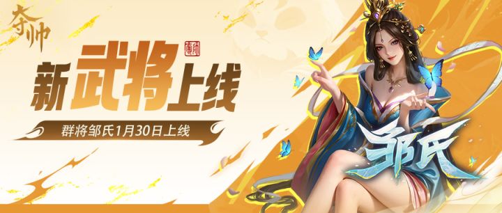 【神仙阁限时概率up】本期神仙阁为终极大奖限时4倍概率UP抽取武将上新:邹氏+祸水香魂·邹氏【新品武将】活动时间:2026/01/30 00:00:00-2026/02/13 23:59:59活动入口:神仙阁神仙阁上新:邹氏技能:祸水被弃置时,抽2张牌【同期上新·新皮肤】祸水香魂·邹氏【虎符上新】活动时间:2026/01/30 00:00:00-2026/02/05 23: