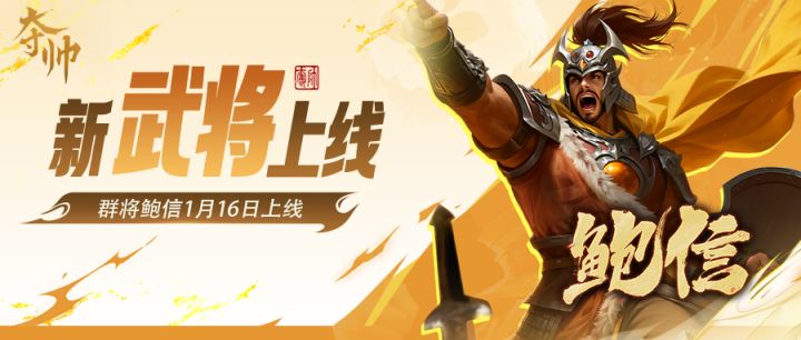 【神仙阁限时概率up】本期神仙阁为终极大奖限时4倍概率UP抽取武将上新:鲍信+墨染忠魂·鲍信【新品武将】活动时间:2026/01/16 04:00:00-2026/01/30 23:59:59活动入口:神仙阁神仙阁上新:鲍信技能:募讨登场,在其它两个战场各置入一个粮草消耗等于此武将战力的随机武将。(若该粮草消耗无对应武将,则向下取存在对应武将的最高值)【同期上新·新皮肤】墨染忠魂